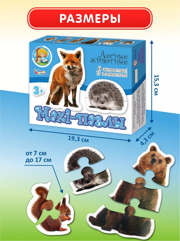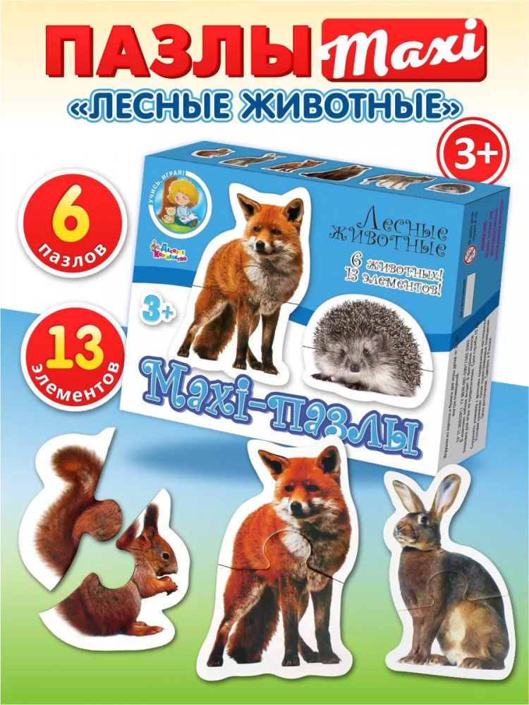 Серия: Учись, играя Макси-пазлы «Лесные животные» 13 элементов серии «Учись играя» — это увлекательная игра-головоломка, которая поможет развить у ребенка воображение, пространственное мышление и память. Собирая пазлы, Ваш малыш научится терпению, усидчивости, умению концентрировать внимание. А реалистичные картинки помогут ему узнать какие животные относятся к лесным. Подключайтесь к игре, пусть ребенок собирает картинки, а вы подробно расскажите ему, кто именно получился на картинках. Попросите его повторить рассказ. |