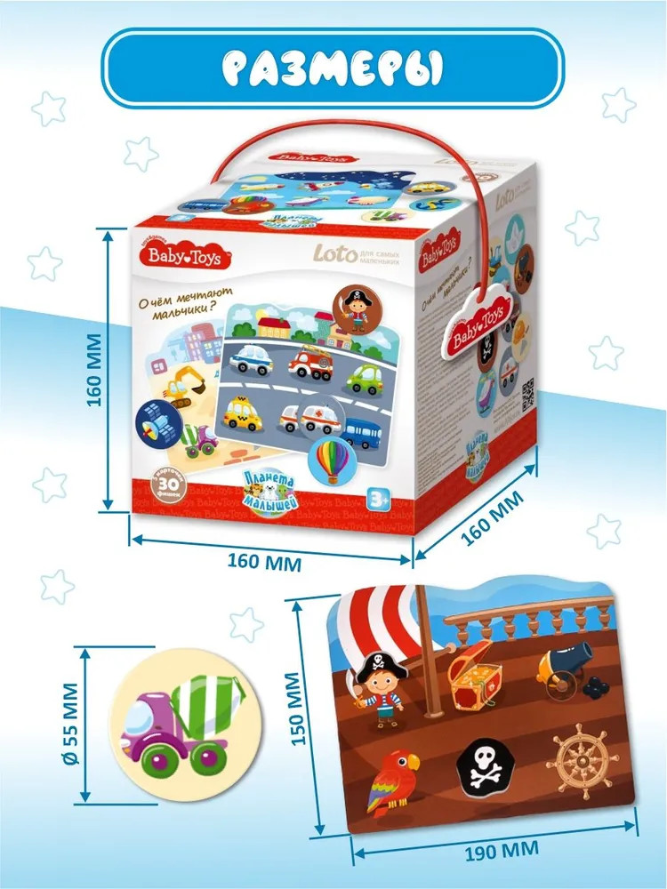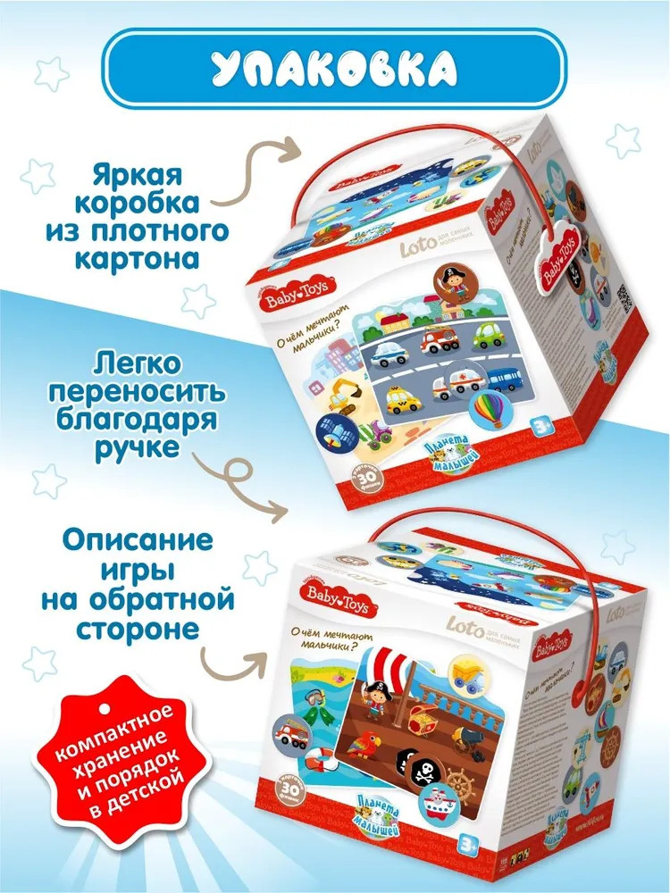 Ваш малыш с удовольствием позовет друзей и вместе с ними сыграет в лото, проявляя азарт и тренируя скорость реакции. А еще кроха сможет расширить свой кругозор новыми знаниями, ведь каждая карточка знакомит ребенка с транспортными средствами и многими другими объектами, которые так нравятся мальчишкам.
