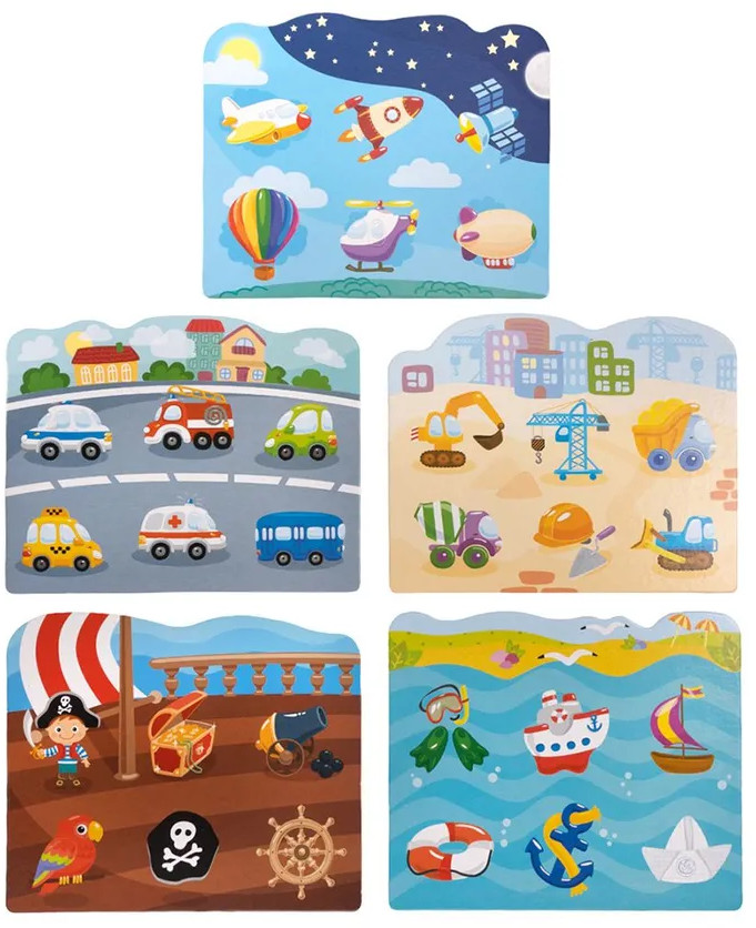• поэтому на карточках изображены различные транспортные средства и спецтехника, пиратский корабль и водоем для плавания;
