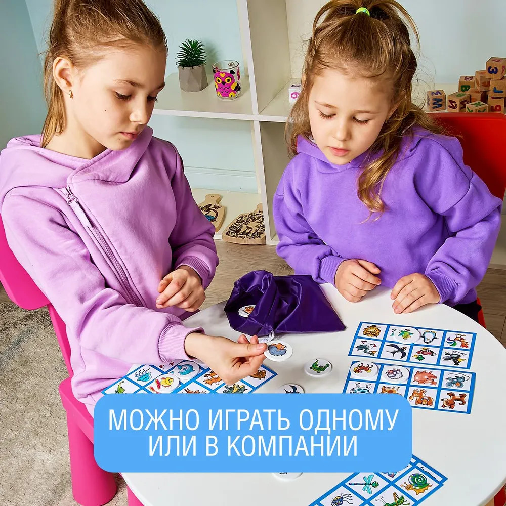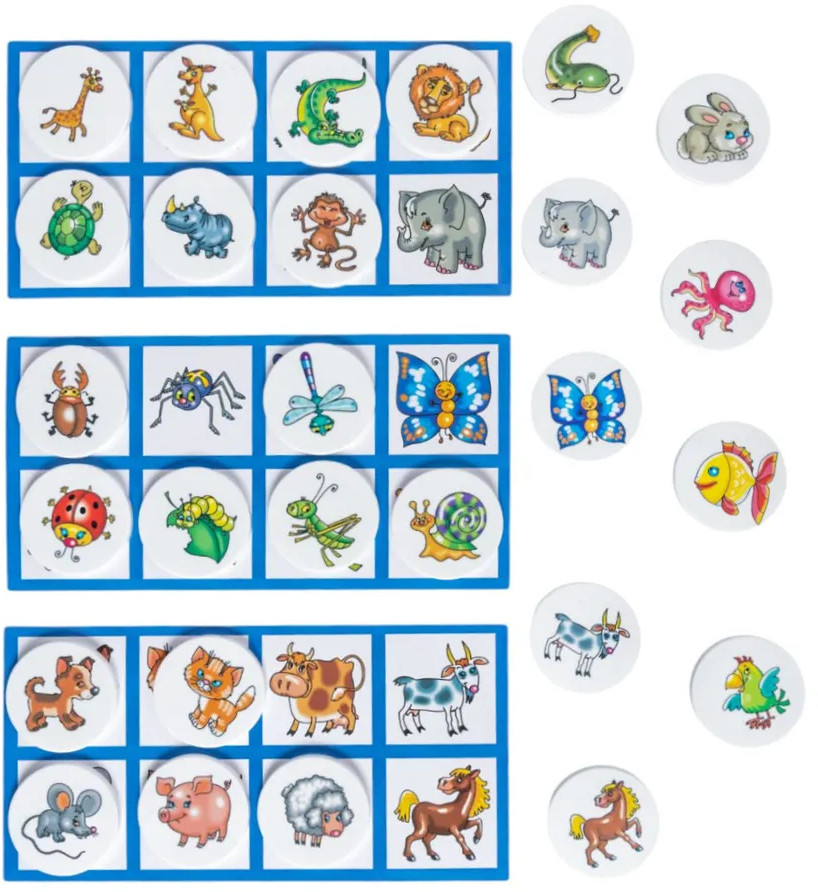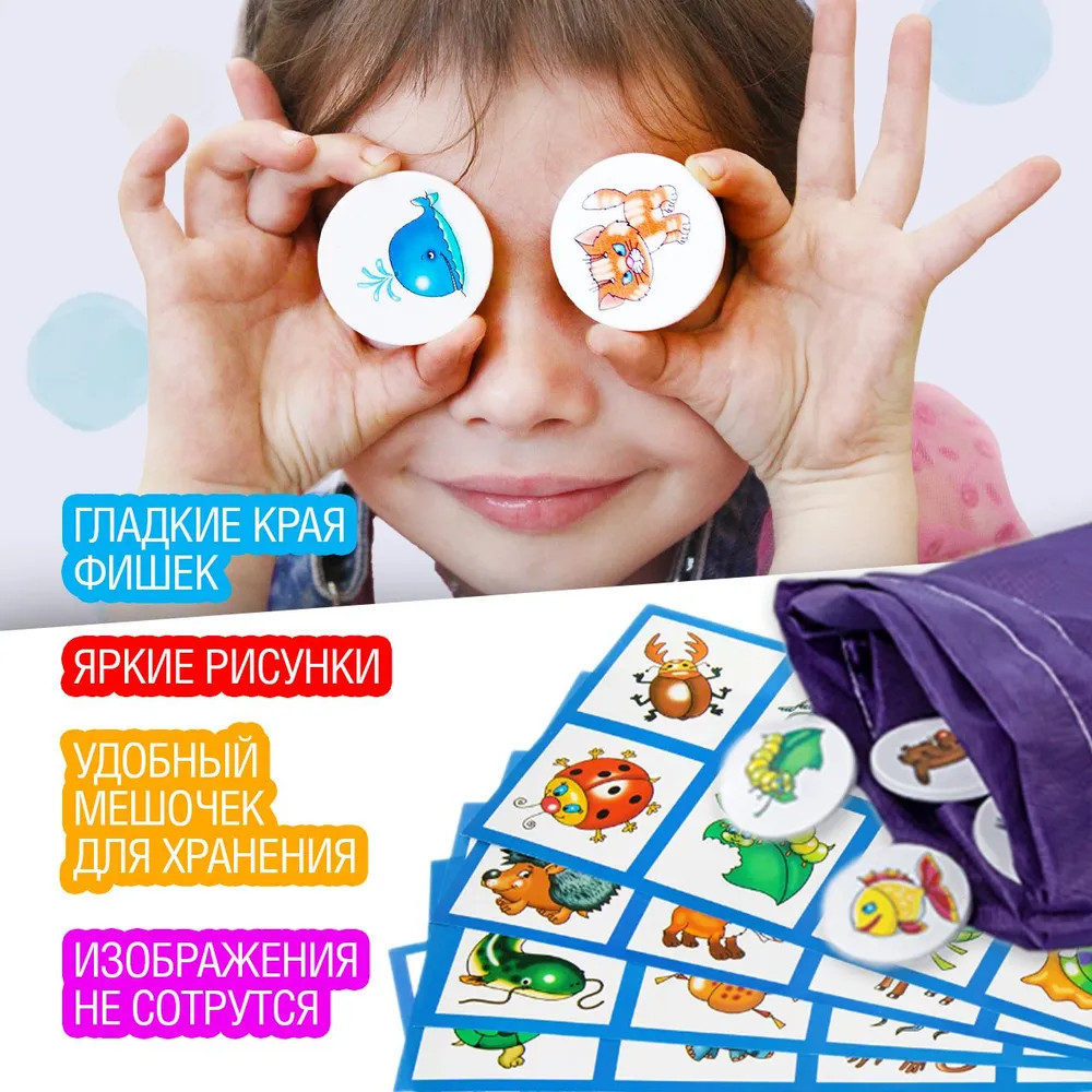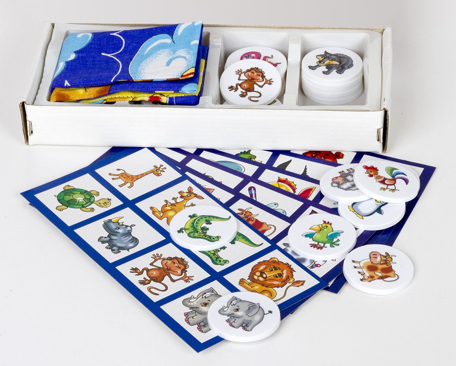 В коробочке: картинки со зверятами, круглые фишки с яркими картинками, мешочек доя хранения. Спасибо