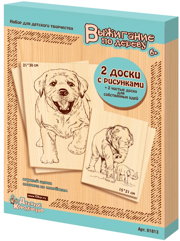 • в красочной картонной коробке ребенок найдет 2 фанерных досочки с нанесенным рисунком и 2 чистые доски, на которые кроха сможет нанести собственный рисунок;