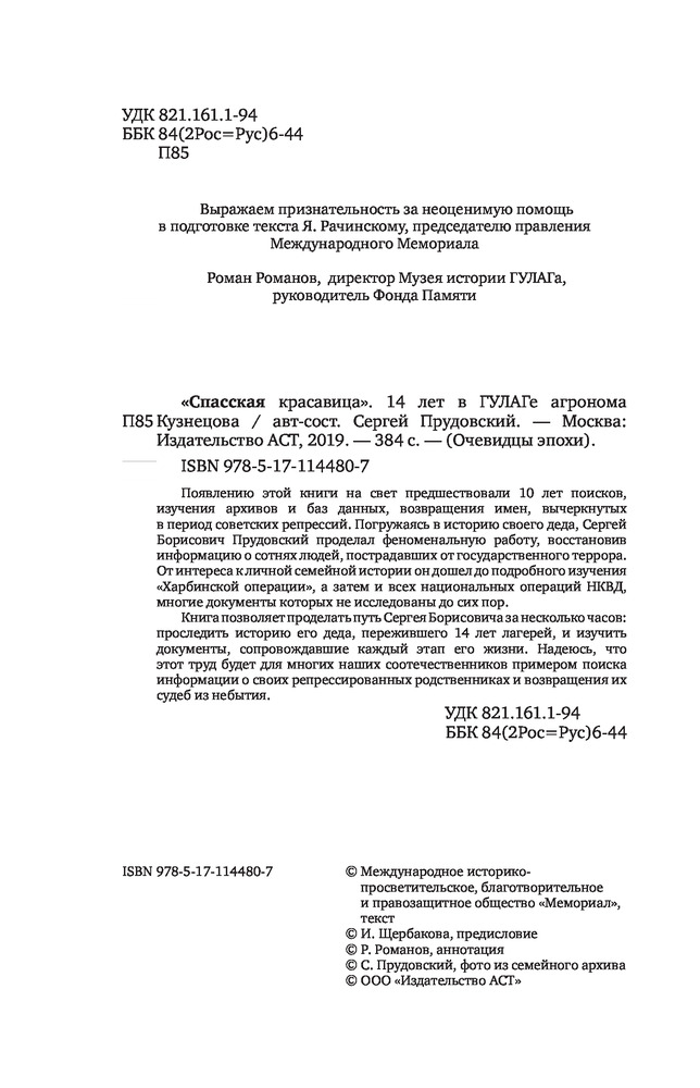 💳 Оплатить за товар можно при получении 🇰🇿 Есть бесплатная доставка по Казахстану 🎁 Копите бонусы с каждой покупки Серия: Очевидцы эпохи Появлению этой книги на свет предшествовали 10 лет поисков, изучения архивов и баз данных, возвращения имен, вычеркнутых в период советских репрессий. Погружаясь в историю своего деда, Сергей Борисович Прудовский проделал феноменальную работу, восстановив информацию о сотнях людей, пострадавших от государственного террора. |