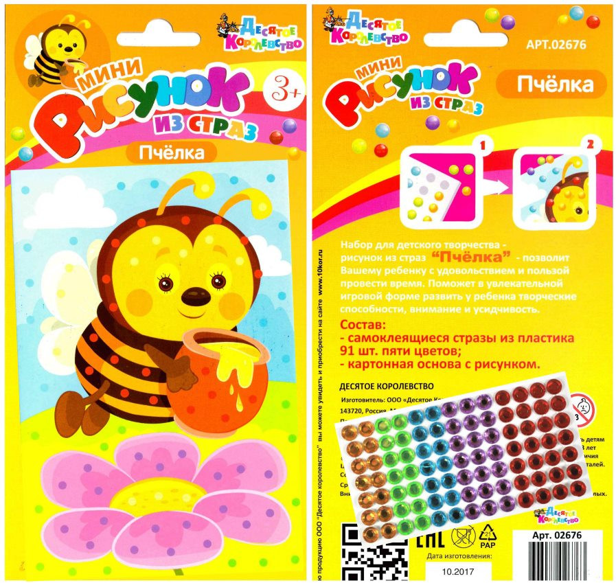 Десятое королевство Рисунок из страз «Пчелка»В данный момент этот товар отсутствует в продаже. Возможно, у нас найдется аналогичный или похожий товар здесь. Набор для детского творчества мини-рисунок из страз «Пчелка» позволит Вашему ребенку с удовольствием и пользой провести время. Поможет в увлекательной игровой форме развить у ребенка творческие способности, внимание и усидчивость. Игра рекомендована для детей от трех лет. Задача ребенка — украсить рисунок стразами. Для того, чтобы наклеить стразы на картинку необходимо отделить стразы нужного цвета от блока и наклеить его на картинку, плотно прижав, к точкам, соответствующего цвета. |