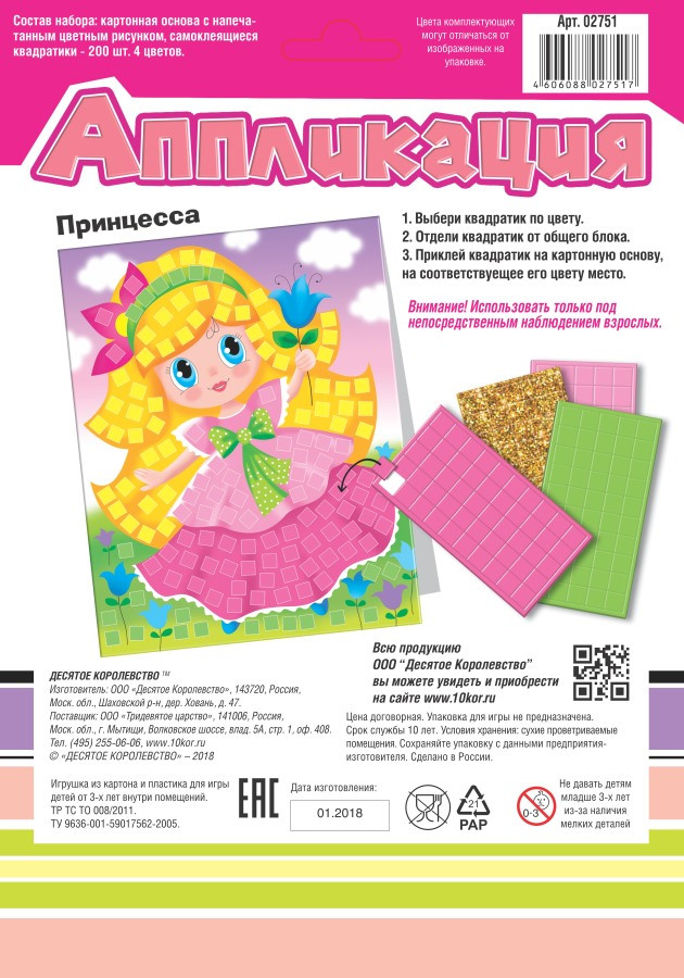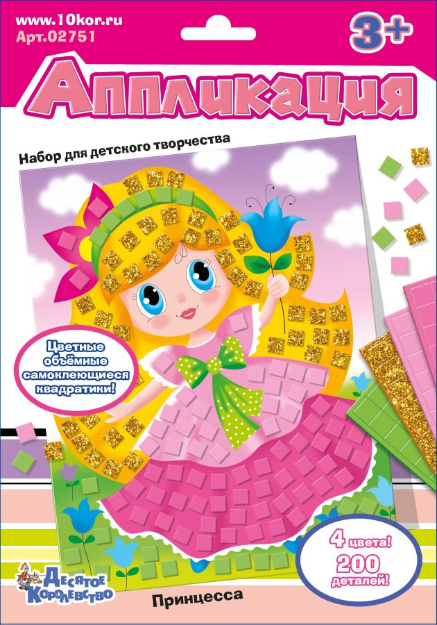 Аппликация «Принцесса» — набор для творчества для детей от 3-х лет. Украшайте картинку самоклеящимися квадратиками, развивайте моторику пальчиков и стимулируйте творческие способности ребёнка. Подберите квадратик по цвету. Отделите самоклеящейся квадратик от блока. Приклейте квадратик на картонную основу, на соответствующее его цвету место. Внимание! Контроль взрослого во время работы с аппликацией обязателен — набор содержит мелкие детали.