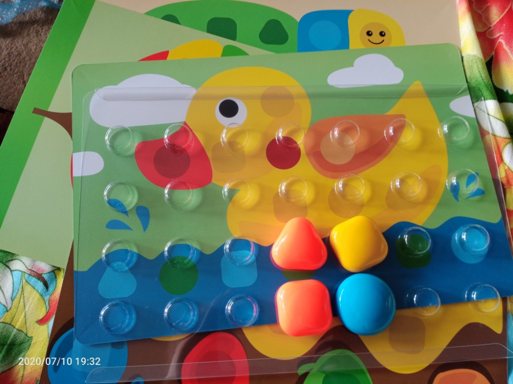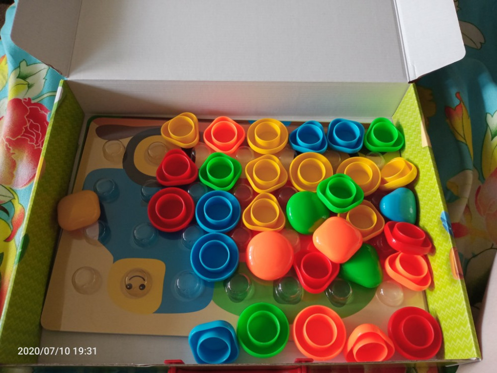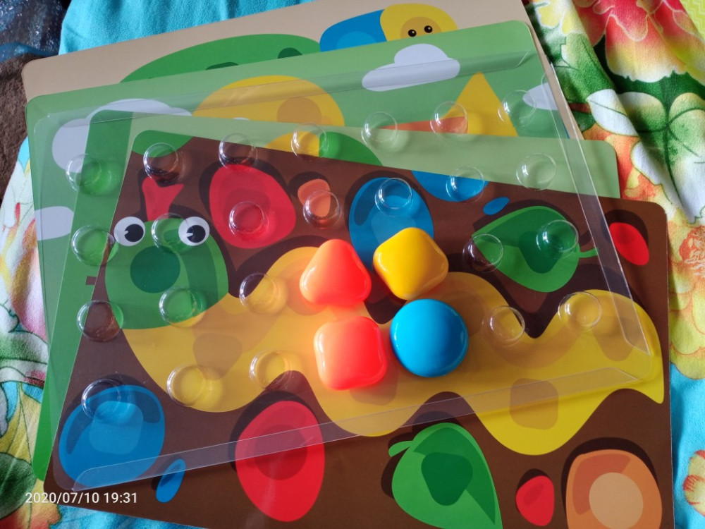 Очень крупные яркие из хорошего пластика фишки, но их маловато. Картинки формата А4 покрыты защитным слоем и удобно вставляются в пластиковую выпуклую подставку, на которую ставятся фишки без фиксации. Дочери 1.1 г. играет с удовольствием, но пока только просто фишки перекладывает.