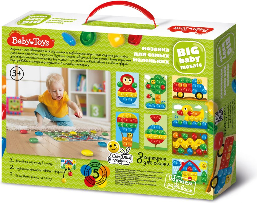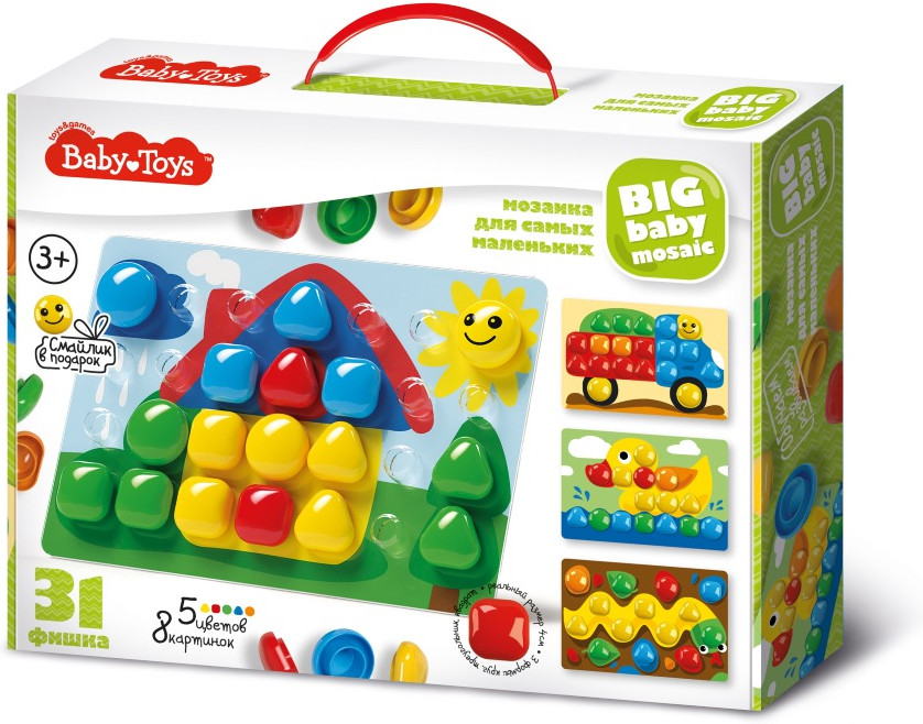 Мозаика из 31 элементов, пяти цветов серии Baby Toys — это увлекательная обучающая и развивающая игра для самых маленьких. Абсолютно безопасна для детей, крупные фишки размером 40 миллиметров невозможно проглотить. Яркие картинки заинтересуют вашего непоседу. В процессе игры ребенок освоит цвета, разовьет координацию движений и мелкую моторику. Мозаика рассчитана на детей начиная с 3 летнего возраста.