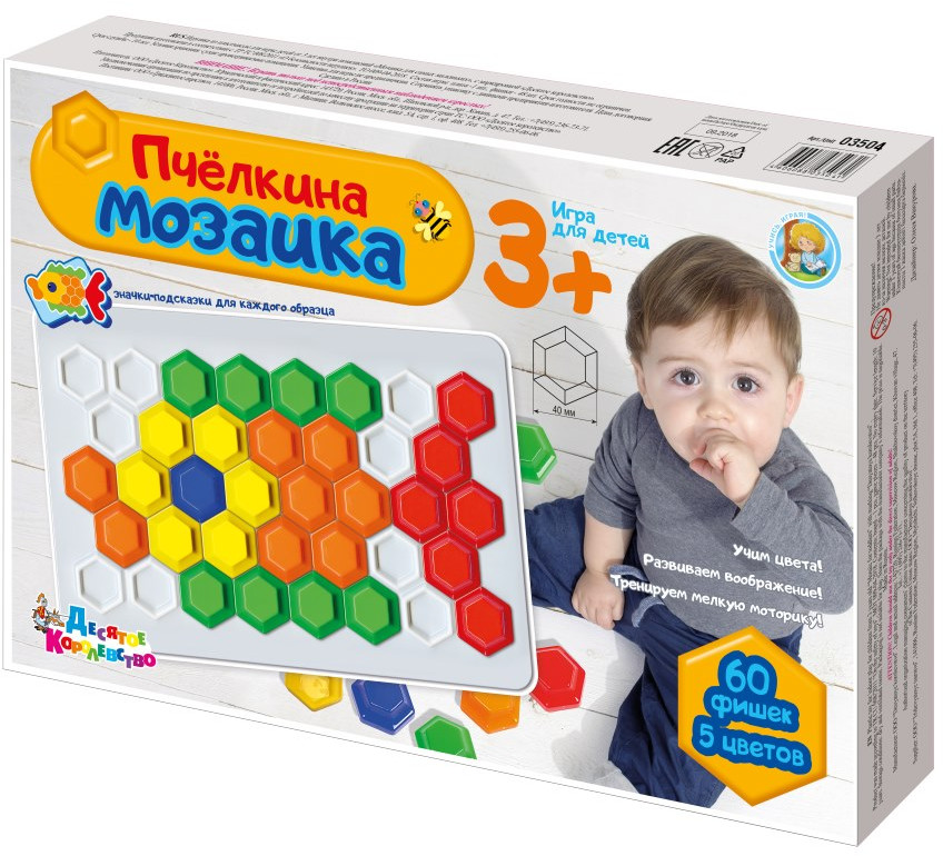 Мозаика «Пчелкина» из 60 элементов, пяти цветов — это увлекательная обучающая и развивающая игра для самых маленьких. Абсолютно безопасна для детей, крупные шестигранные фишки размером 40 миллиметров невозможно проглотить. Яркие картинки заинтересуют вашего непоседу. В процессе игры ребенок освоит цвета, разовьет координацию движений и мелкую моторику. Особенность «Пчелкиной» мозаики заключается в форме фишек – шестигранная форма напоминает пчелиные соты, а форма выступов на плате позволяет легко и правильно установить элементы. Мозаика рассчитана на детей начиная с 3 летнего возраста.