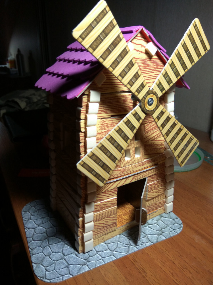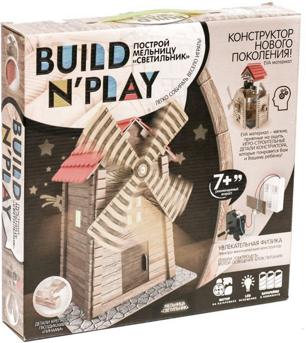 Замечательный конструктор! Собрали - лампочка светится, лопасти вертятся, всё как положено. Коробка большая, качественная - подойдёт на подарок. Единственное, батарейки в наборе есть, но они дохлые, но я и не рассчитывала на них :) В общем, не забываем батарейки, остальное - хорошо! Внутрь окошечке можно заглядывать, там виден камин с картиной над ним, дверь первого этажа открывается, какая-нибудь мелочь там может "жить".