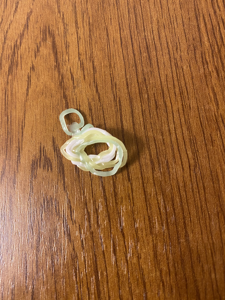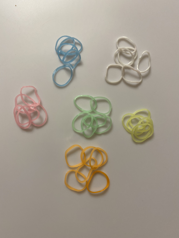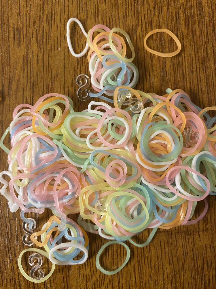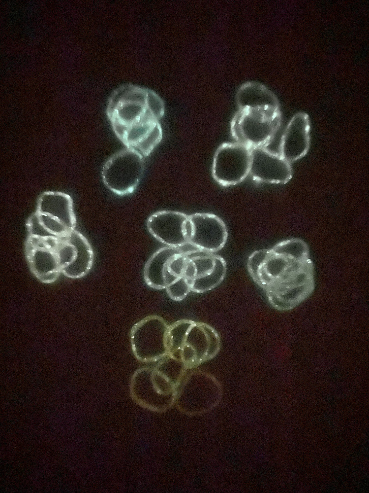 На фото видно, что резиночки между собой склеены общей массой. Разобрать поштучно можно, некоторые при этом рвутся. Клипсы некоторые то же встречаются с браком, на фото видно они меньше объемом. Сами резинки тонкие, но вроде прочные, тянутся хорошо. В темноте светятся, по мне так слабовато. Но красиво, как будто с блестками.