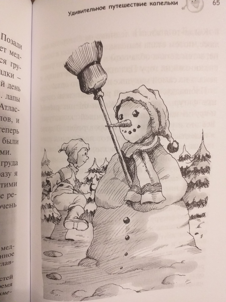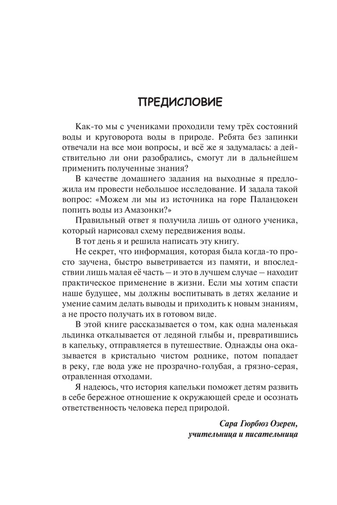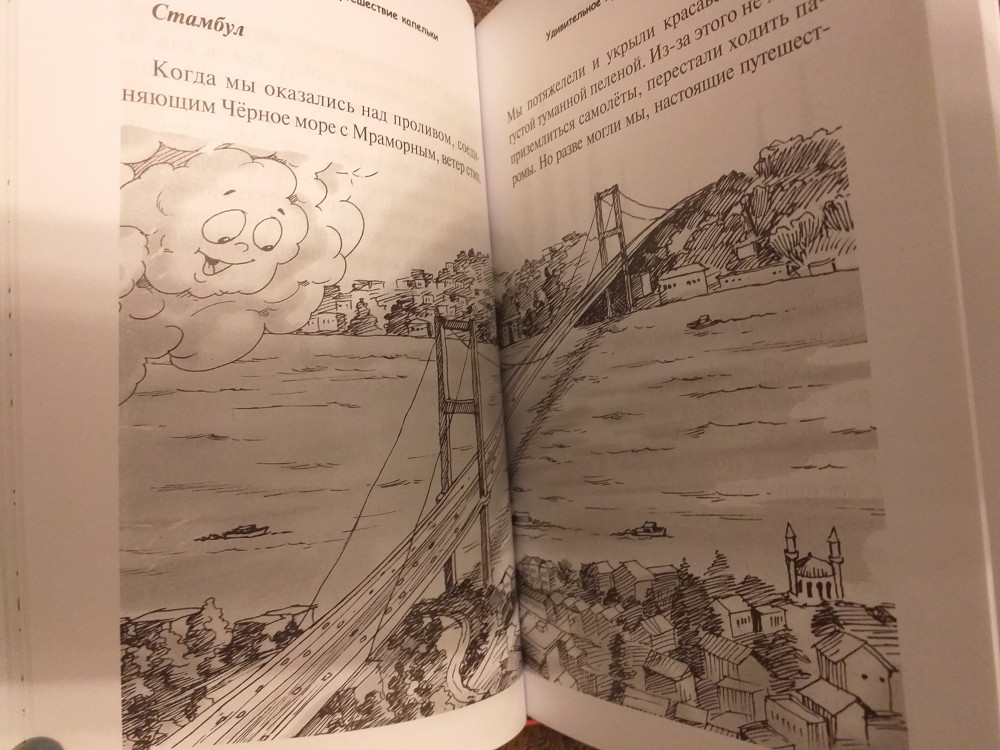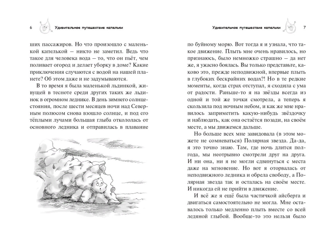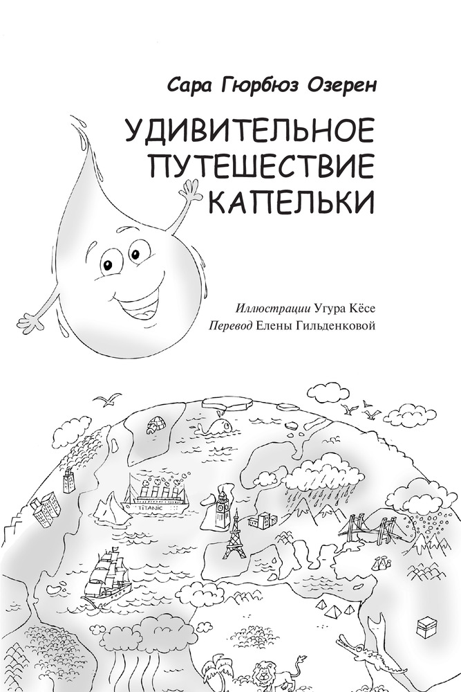 Вот тут очень хочется похвалить молодое издательство за внимательное отношение к своей работе! Книга небольшого, даже немного миниатюрного формата - может поместиться в маленькой сумочке или портфеле школьника, в твердой матовой яркой обложке с выборочной лакировкой, внутри беленький офсет (немного просвечивает, но не напрягает), достаточно крупный шрифт и множество ч/б иллюстраций, сопровождающих текст - картинки почти на каждом развороте! При чтении не было замечено ошибок, опечаток - спасибо редакторам! Иллюстраций, как я уже писала - много! Очень! И они очень эмоциональны! Теперь к главному - текст...Вот тут-то меня и поджидала засада... От книги очень неоднозначные впечатления, поэтому постараюсь как можно подробнее. Автором выступает турецкая учительница Сара Гюрбюз Озерен, а текст приведен в переводе. Кстати, перевод мне понравился - я не спотыкалась, читалось ровно. Книга знакомит нас с маленькой капелькой, заключенной в леднике в Атлантическом океане. Случайно часть ледника откалывается и капелька отправляется в свое первое путешествие! Она растает и течение унесет ее далеко от родного дома, потом она испарится на солнце и вместе с тучами будет плавать в небе, выпадет снегом на горнолыжном курорте, опять растает, проникнет в подземные пещеры, но потом найдет выход и сможет вернуться в родное море! Увлекательно, правда? Вот и мне иногда казалось, что да. А иногда - что слишком долго и однообразно путешествие: она плыла, плыла, плыла, потом летала, летала, летала, после снегом лежала, лежала, лежала, а в конце опять текла, текла, текла... Меня заинтриговал вопрос автора, который она задала ученикам на уроке и который приводится в предисловии: "Можем ли мы из источника на горе Паландокен попить воды из Амазонки?" Я ожидала, что вот сейчас-то мне нарисуют все маршруты, входы и выходы, да еще в мировом масштабе! Но путешествие конкретного героя сводилось к Атлантическому океану, берегам Африки и проливу Босфор, турецкому курорту, турецким подземным пещерам, турецким деревням на берегах. В общем, понятно, что автор старалась подробнее остановиться на родной земле)) Это конечно, хорошо - в тексте говорится немного о культуре, о традициях Турции, но мне хотелось бОльшего масштаба) В тексте нет диалогов, у героя нет друзей. То есть капелька радуется встречам со своими старыми друзьями - рыбами, дельфинами, но друзья получаются какими-то обобщенными и никто конкретно именно эту капельку не знает. Капелька начинает путешествие наивным неопытным малышом, который старается разобраться в окружающем мире и я вместе с ней планировала узнать, как же возникают гром и молнии? Однако в тексте написано лишь (капелька в составе тучи): "А туча все росла и становилась темнее...От трения с земной поверхностью в нам накапливалось электричество...огненные всполохи появляются всего лишь из-за того, что тучи трутся о воздух и землю и наэлекризовываются. Сейчас даже в моем маленьком теле скопилось бесчисленное множество электронов. И мне уже не терпится поскорее от них освободиться." Все. Я ждала более понятной информации. Но несмотря на такую неосведомленность в окружающем мире и желание все понять и объяснить, главная героиня упоминает и водовороты, и сталактиты, и работу воды для производства электричества как само собой разумеющееся и не требующее пояснений