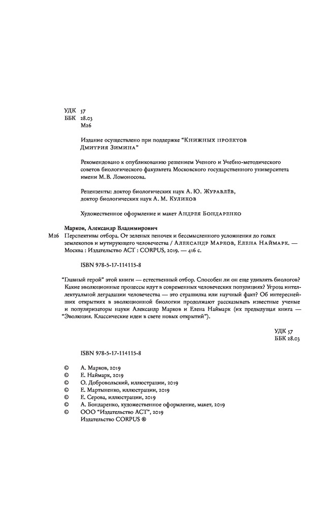 Серия: Элементы (Россия) «Главный герой» этой книги — естественный отбор. Способен ли он еще удивлять биологов? Какие эволюционные процессы идут в современных человеческих популяциях? Угроза интеллектуальной деградации человечества — это страшилка или научный факт? Об интереснейших открытиях в эволюционной биологии продолжают рассказывать известные ученые и популяризаторы науки Александр Марков и Елена Наймарк (их предыдущая книга — «Эволюция. Классические идеи в свете новых открытий»). |
