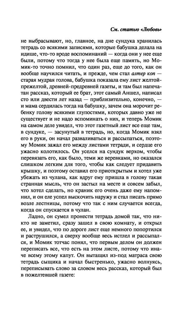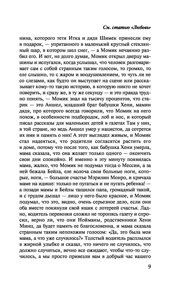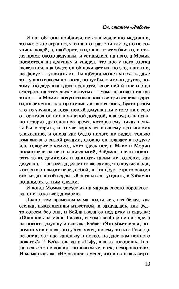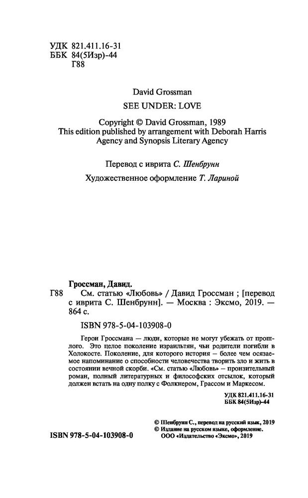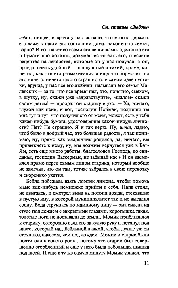 См. статью «ЛюбовьВ данный момент этот товар отсутствует в продаже. Возможно, у нас найдется аналогичный или похожий товар здесь. Серия: Литературные хиты: Коллекция Герои Гроссмана — люди, которые не могут убежать от прошлого. Это целое поколение израильтян, чьи родители погибли в Холокосте. Поколение, для которого история — более чем осязаемое напоминание о способности человечества творить зло и жить в состоянии вечной скорби. «См. статью «Любовь» — пронзительный роман, полный литературных и философских отсылок, который должен встать на одну полку с Фолкнером, Грассом и Маркесом. |