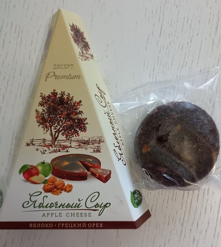 Думала яблочный сыр будет таким же треугольным, но внутри лежал кругляшок меньше размером. На укус жестковато, на вкус вкусно. Можно на подарок, для себя маловато в упаковке. Беру другую пастилу, мягче и дешевле.