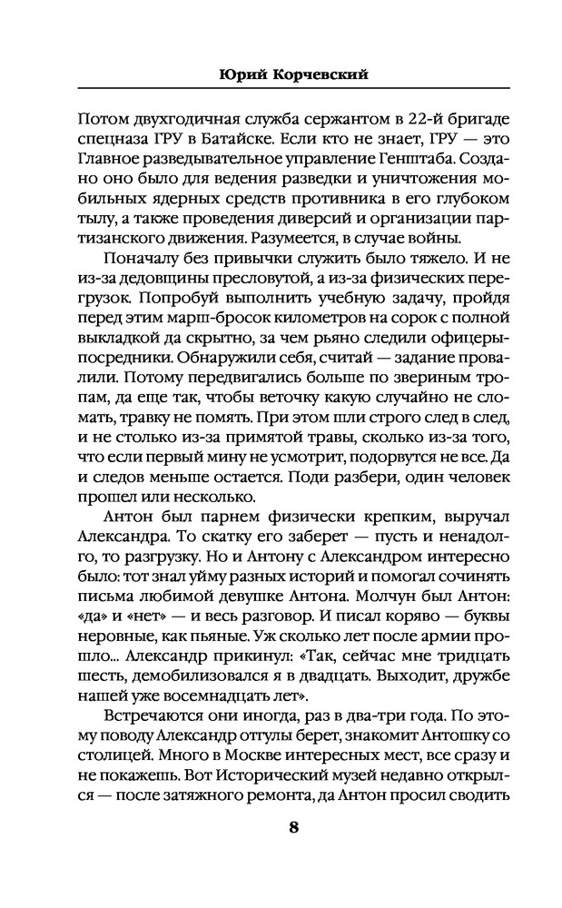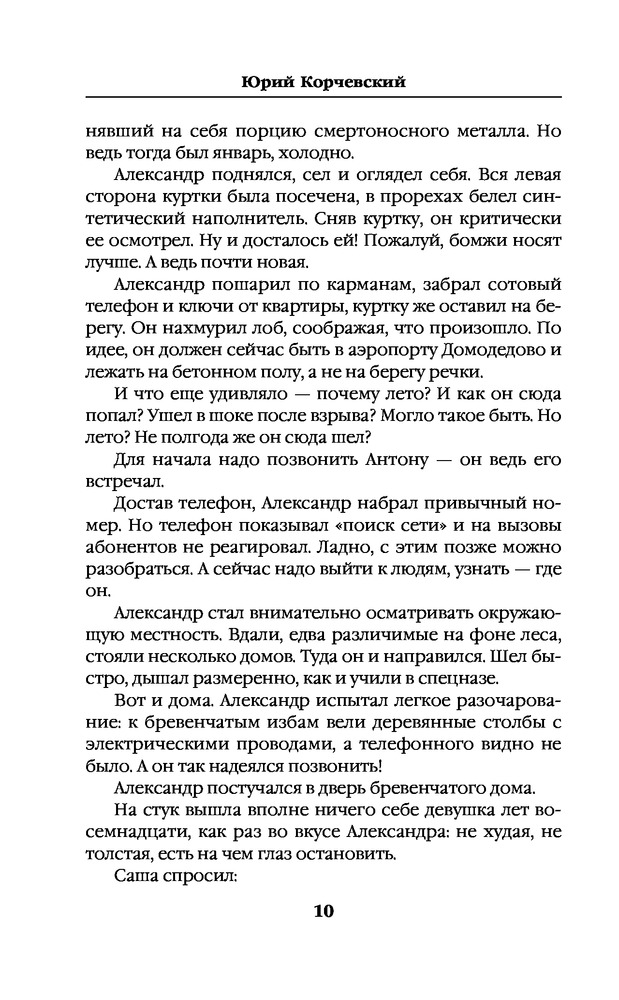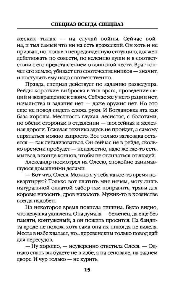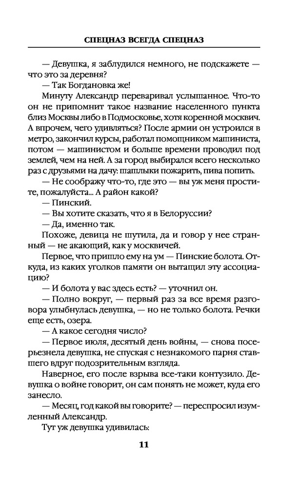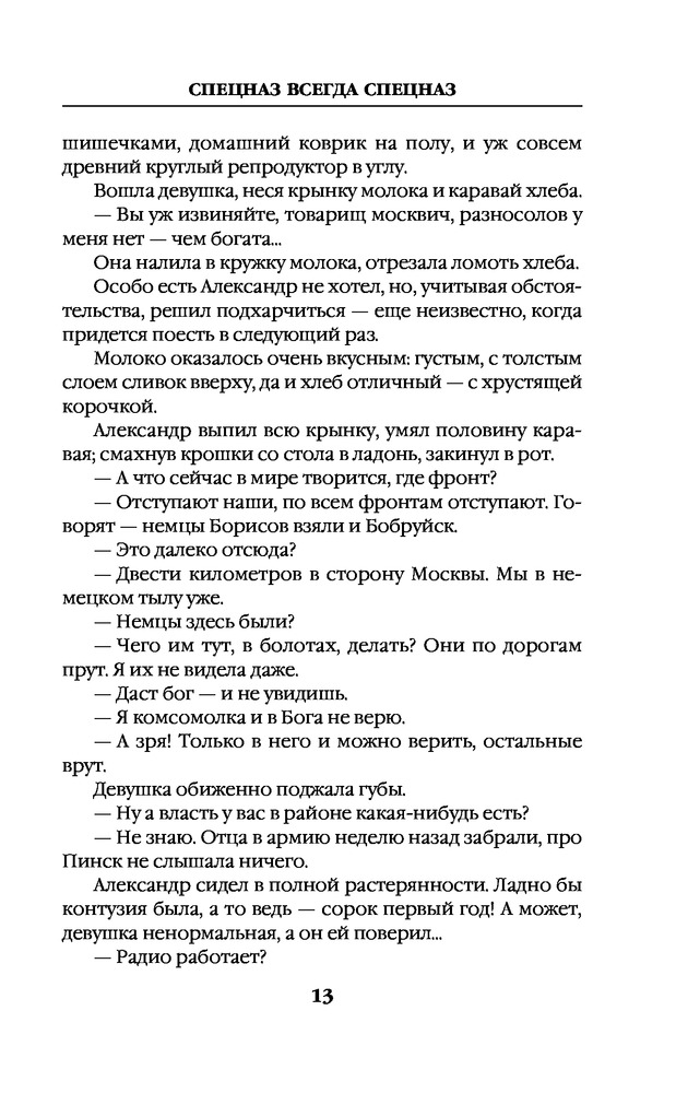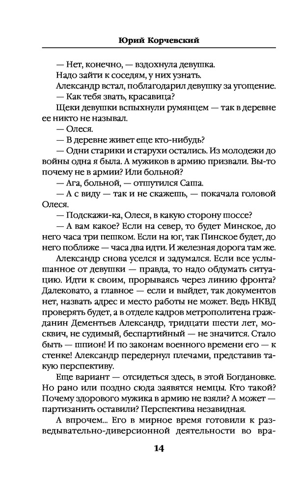 Разочаровал. Роман написанный методом "копировать - вставить". Постоянные повторы, отсутствие прописанных и правдоподобных персонажей. Напоминает антисоветскую агитку - советские люди какие -то зомби с промытыми мозгами и одной извилиной, низким уровнем образование, и манией подозрительности. Политрук - садист, трус и тупица. Немцы великая нация - у них порядок, дисциплина, выучка, высокий уровень техники, забота о своих подчинённых. Один недостаток - ведут войну и убивают мирное население. Главный герой - этакий российский Рэмбо, одним махом десятерых побивахом, превосходящий целого партизанского отряда. Смерть подкарауливает его, но всё складывается удачно - случайно споткнётся, чуть-чуть задержится и избегает пули, взрыва и т. д, и хотя рядом гибнут люди, а он опять один остаётся в живых. Но вершина его везения, когда в горящей мельнице, обложенный превосходящими силами противника, он видит волшебный шар, который и переносит его в безопасное место. Что это за шар - неизвестно.