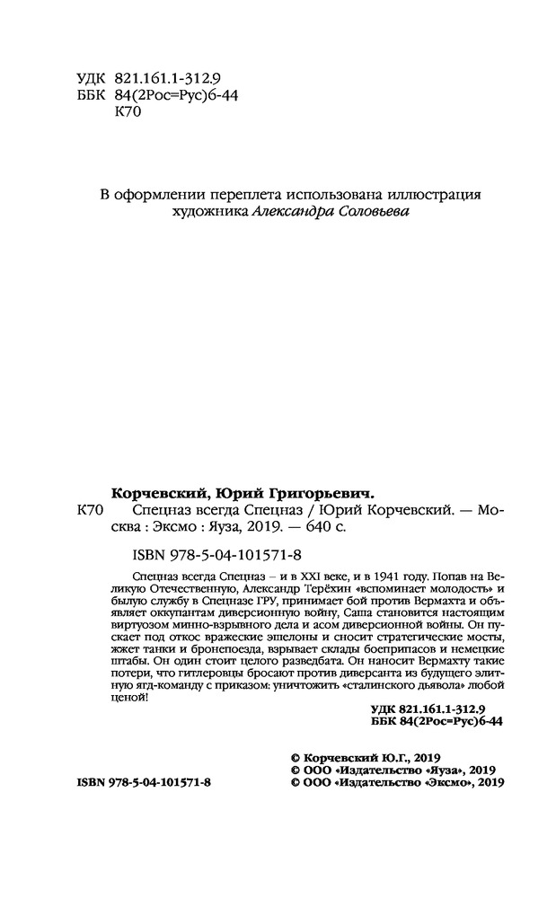Спецназ всегда СпецназВ данный момент этот товар отсутствует в продаже. Возможно, у нас найдется аналогичный или похожий товар здесь. Серия: Лучшая фантастика о Великой Отечественной войне Спецназ всегда Спецназ — и в XXI веке, и в 1941 году. Попав на Великую Отечественную, Александр Терёхин «вспоминает молодость» и былую службу в Спецназе ГРУ, принимает бой против Вермахта и объявляет оккупантам диверсионную войну, Саша становится настоящим виртуозом минно-взрывного дела и асом диверсионной войны. Он пускает под откос вражеские эшелоны и сносит стратегические мосты, жжет танки и бронепоезда, взрывает склады боеприпасов и немецкие штабы. Он один стоит целого разведбата. Он наносит Вермахту такие потери, что гитлеровцы бросают против диверсанта из будущего элитную ягд-команду с приказом: уничтожить «сталинского дьявола» любой ценой!  |