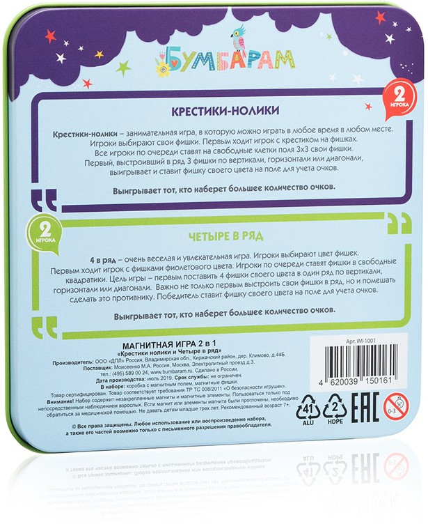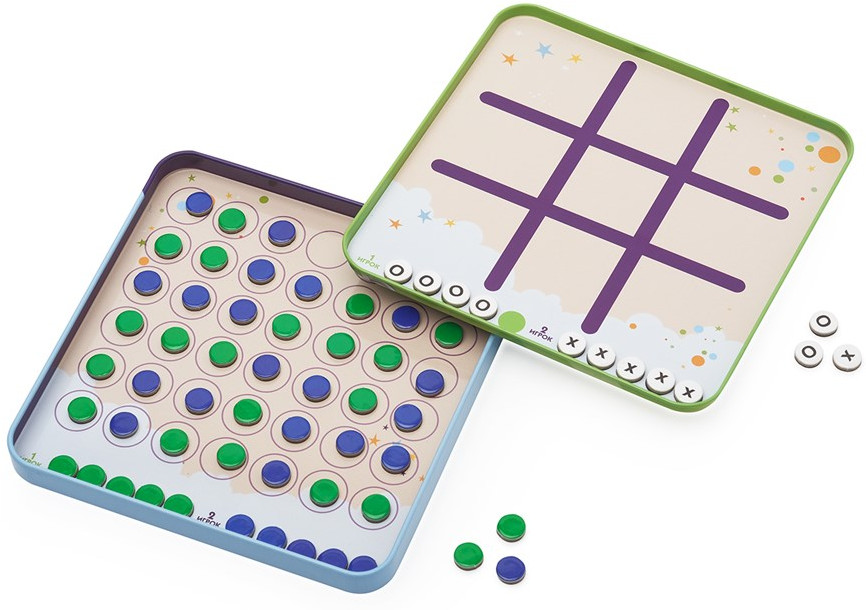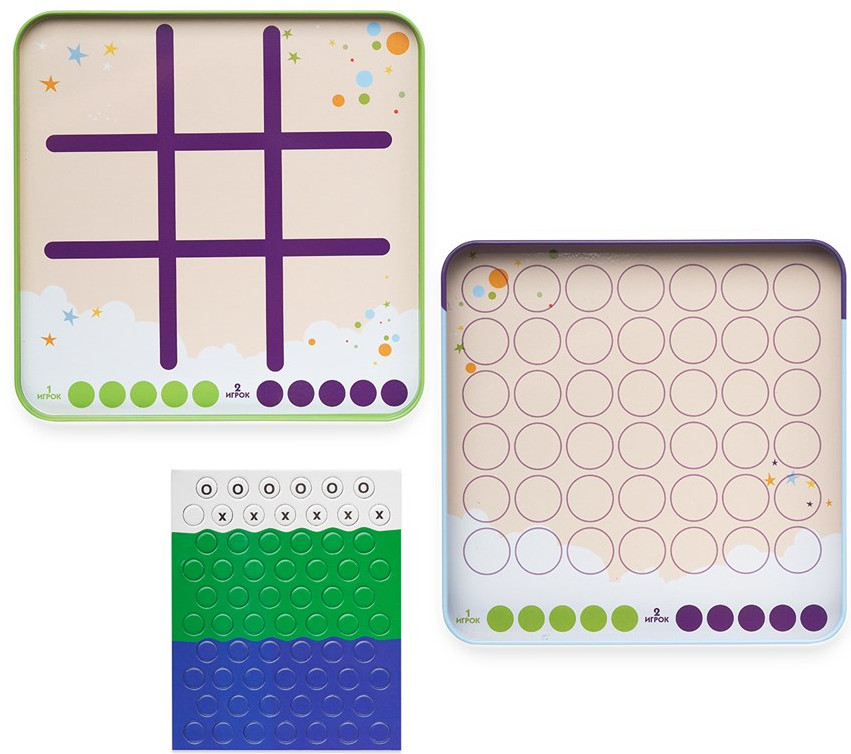 В одном наборе вы найдете 2 самые популярные игры, в которые можно сыграть с другом. «Крестики-нолики» и «4 в ряд» не занимают много времени, зато отлично развивают логику и стратегическое мышление. Попробуйте первым выложить ряд фишек одинакового цвета. Ваш соперник сделает всё, чтобы вам помешать!