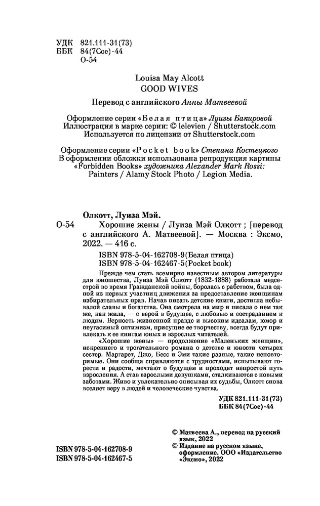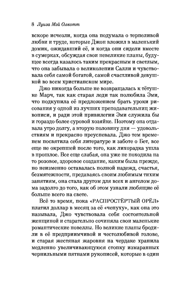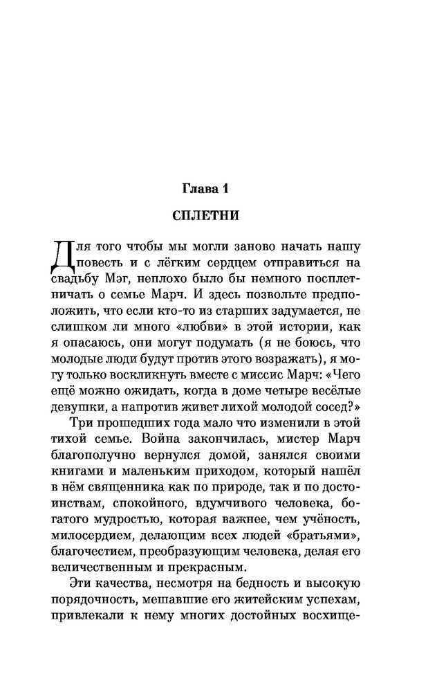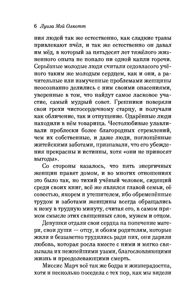 Серия: Pocket Book (обложка) Прежде чем стать всемирно известным автором литературы для юношества, Луиза Мэй Олкотт (1832-1888) работала медсестрой во время Гражданской войны, боролась с рабством, была одной из первых участниц движения за предоставление женщинам избирательных прав. Начав писать детские книги, достигла небывалой славы и богатства. Она смотрела на мир и писала о нем так же, как жила, — с верой в будущее, с любовью и состраданием к людям. Верность жизненной правде и высоким идеалам, юмор и неугасимый оптимизм, присущие ее творчеству, всегда будут привлекать к ее книгам юных и взрослых читателей. |