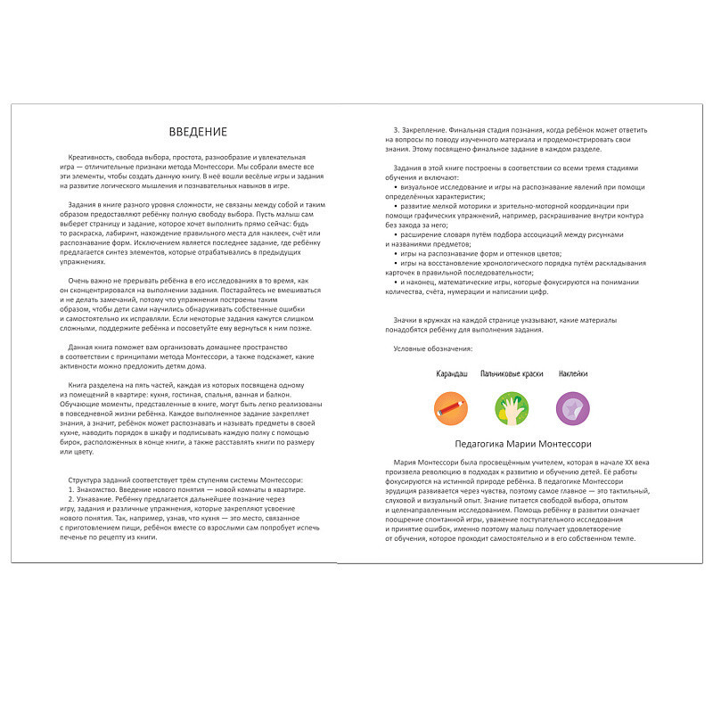Книга поможет организовать домашнее пространство в соответствии с принципами метода Монтессори и подскажет, какие активности можно предложить детям дома — все обучающие моменты, представленные в книге, могут быть легко реализованы в повседневной жизни ребенка.