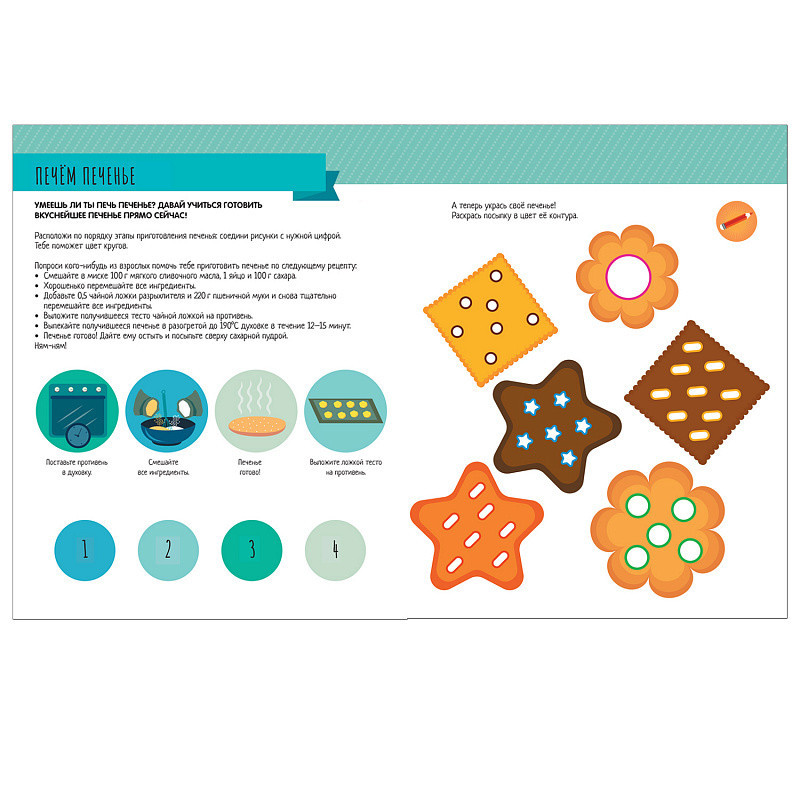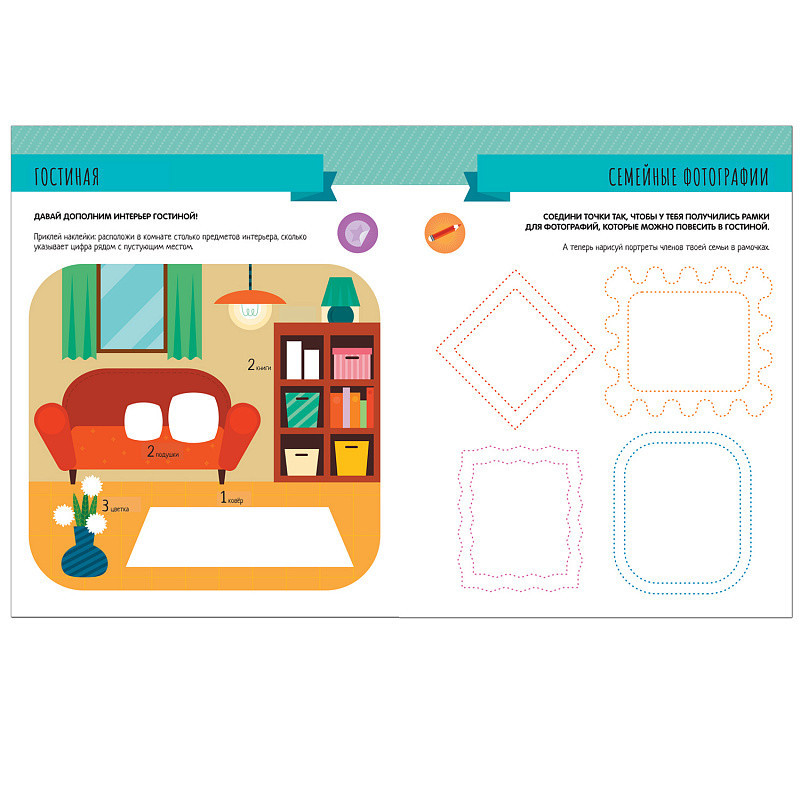 Распределяя по страницам наклейки, дорисовывая и раскрашивая картинки, решая интересные задачи и головоломки, ребенок познакомится с помещениями в доме и предметами, которые можно в них встретить, освоит навыки счета, научится различать оттенки цветов и ориентироваться в пространстве.
