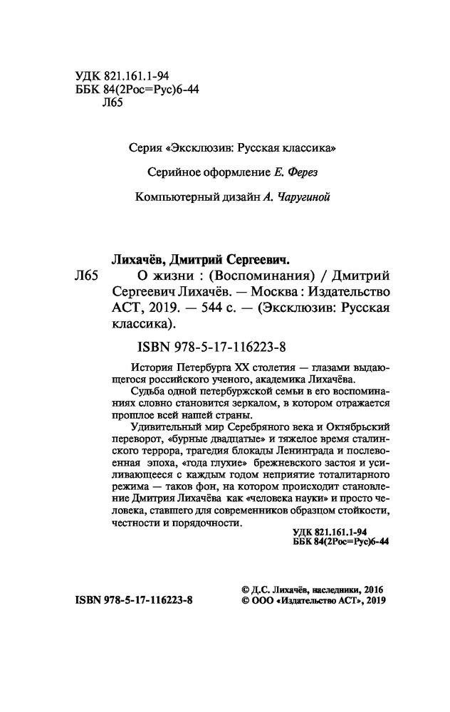 Серия: Эксклюзив: Русская классика История Петербурга ХХ столетия — глазами выдающегося российского ученого, академика Лихачёва. Судьба одной петербуржской семьи в его воспоминаниях словно становится зеркалом, в котором отражается прошлое всей нашей страны. Удивительный мир Серебряного века и Октябрьский переворот, «бурные двадцатые» и тяжелое время сталинского террора, трагедия блокады Ленинграда и послевоенная эпоха, «года глухие» брежневского застоя и усиливающееся с каждым годом неприятие тоталитарного режима — таков фон, на котором происходит становление Дмитрия Лихачёва как «человека науки» и просто человека, ставшего для современников образцом стойкости, честности и порядочности. |