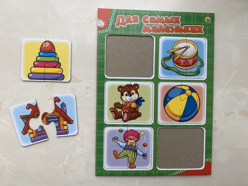 Плотный картон, картинка состоит из двух пазлов, цена смешная. Немного сложновато картинку вынимать из рамки. В левом верхнем углу кусочек порван, на игру не влияет, но все равно товар должен соответствовать эстетическому виду, за это сняла звезду.
