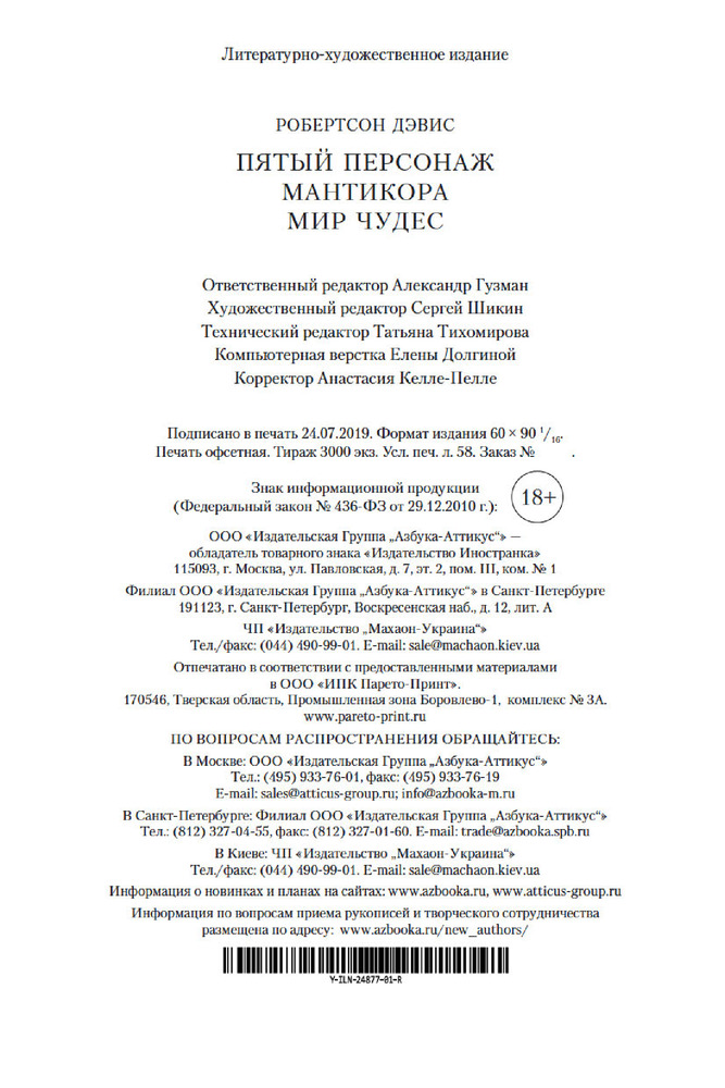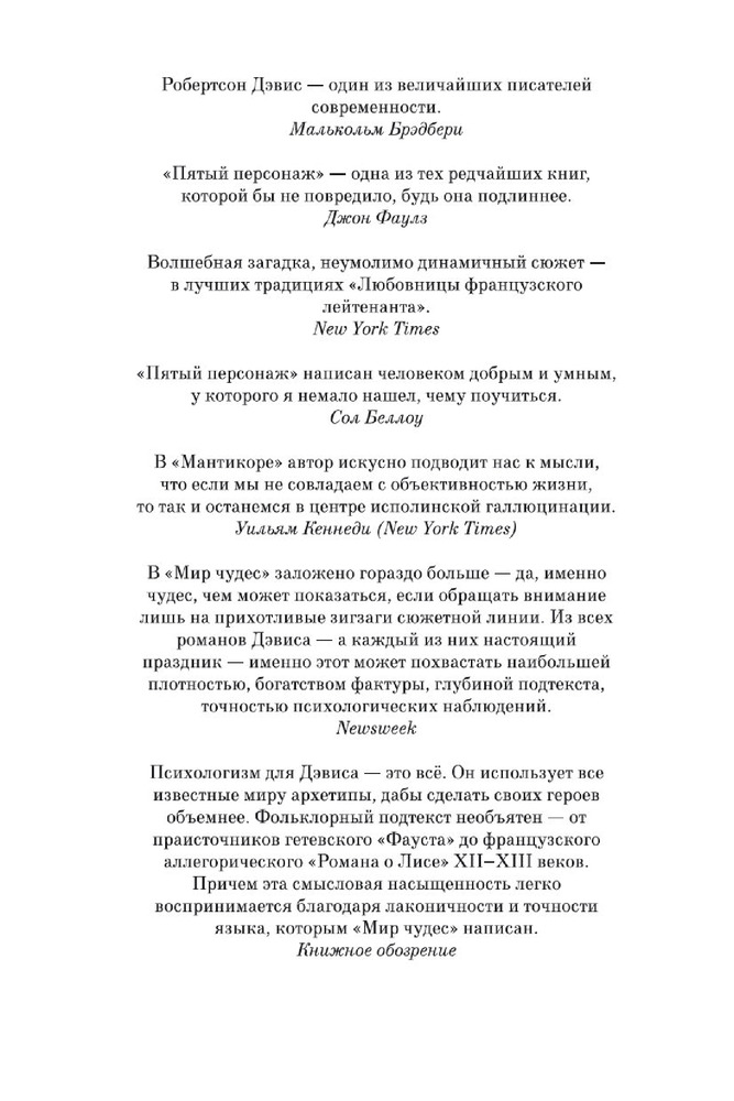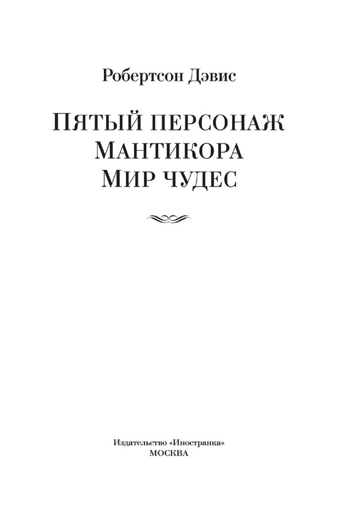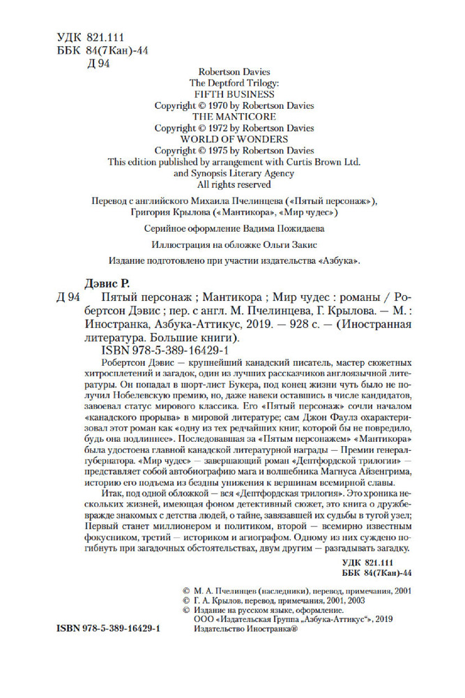 Пятый персонаж. Мантикора. Мир чудесВ данный момент этот товар отсутствует в продаже. Возможно, у нас найдется аналогичный или похожий товар здесь. Серия: Иностранная литература. Большие книги Робертсон Дэвис — крупнейший канадский писатель, мастер сюжетных хитросплетений и загадок, один из лучших рассказчиков англоязычной литературы. Он попадал в шорт-лист Букера, под конец жизни чуть было не получил Нобелевскую премию, но, даже навеки оставшись в числе кандидатов, завоевал статус мирового классика. Его «Пятый персонаж» сочли началом «канадского прорыва» в мировой литературе; сам Джон Фаулз охарактеризовал этот роман как «одну из тех редчайших книг, которой бы не повредило, будь она подлиннее». Последовавшая за «Пятым персонажем» «Мантикора» была удостоена главной канадской литературной награды — Премии генерал-губернатора. «Мир чудес» — завершающий роман «Дептфордской трилогии» — представляет собой автобиографию мага и волшебника Магнуса Айзенгрима, историю его подъема из бездны унижения к вершинам всемирной славы.   |