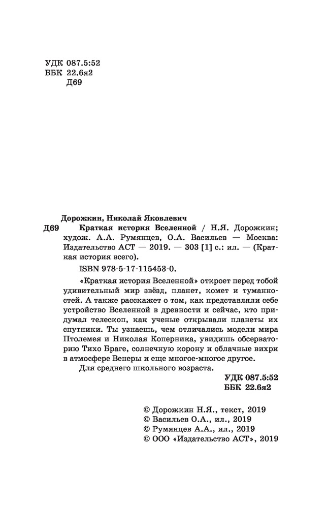 Краткая история ВселеннойВ данный момент этот товар отсутствует в продаже. Возможно, у нас найдется аналогичный или похожий товар здесь. Серия: Краткая история всего «Краткая история Вселенной» откроет перед тобой удивительный мир звёзд, планет, комет и туманностей. А также расскажет о том, как представляли себе устройство Вселенной в древности и сейчас, кто придумал телескоп, как ученые открывали планеты их спутники. Ты узнаешь, чем отличались модели мира Птолемея и Николая Коперника, увидишь обсерваторию Тихо Браге, солнечную корону и облачные вихри в атмосфере Венеры и еще многое-многое другое. Для среднего школьного возраста.  |
