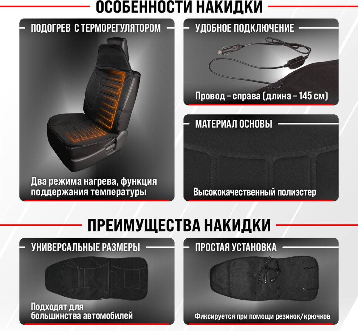 Подогрев сиденья с совершенно новым нагревательным элементом. Вы почувствуете разницу с первой минуты. Быстрый и интенсивный нагрев не заставит Вас долго ждать. Конструкция изделия прочная, имеет универсальный размер и систему крепления, которая позволит использовать аксессуар на различных автомобилях. Подогрев с терморугелятором имеет 2 режима работы и дополнительный предохранитель в комплекте. |