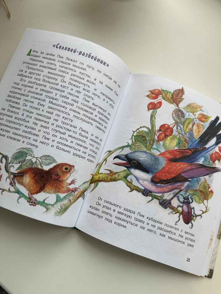 Мышонок ПикВ данный момент этот товар отсутствует в продаже. Возможно, у нас найдется аналогичный или похожий товар здесь. Серия: Первые книжки о животных Книга Виталия Бианки «Мышонок Пик» поведает удивительную, полную опасностей и приключений историю об отважном зверьке, преодолевающем в борьбе за жизнь множество испытаний. В книге есть научно-познавательные вставки с иллюстрациями для детей, которые расскажут, кто такие сорокопут-жулан и рыболов-скопа, какие бывают мыши и ложатся ли они в спячку в холодное время года. Для младшего школьного возраста. |