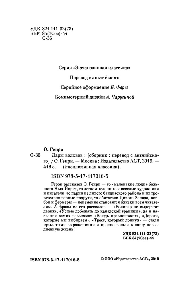 💳 Оплатить за товар можно при получении 🇰🇿 Есть бесплатная доставка по Казахстану 🎁 Копите бонусы с каждой покупки Серия: Эксклюзивная классика Герои рассказов О. Генри — то «маленькие люди» большого Нью-Йорка, то легкомысленные и веселые художники и писатели, то парни из лихого бандитского района и их трогательно верные подруги, то обитатели Дикого Запада, ковбои и фермеры — неизменно становятся близки всем читателям. А фразы из его рассказов — «Боливар не выдержит двоих», «Успею добежать до канадской границы», да и названия самих рассказов: «Вождь краснокожих», «Дороги, которые мы выбираем», «Трест, который лопнул» — стали крылатыми выражениями и прочно вошли в нашу повседневную жизнь! |