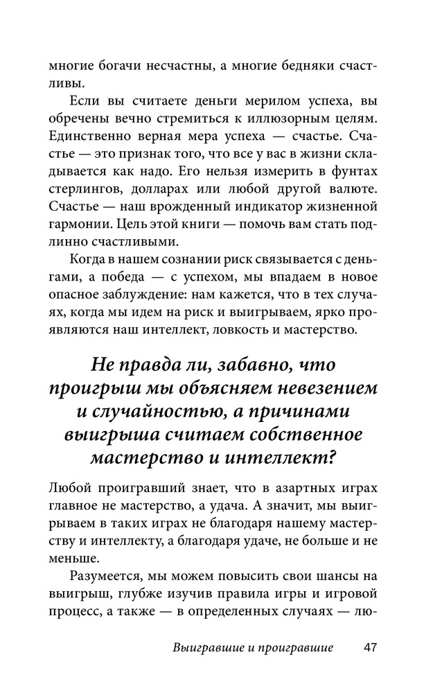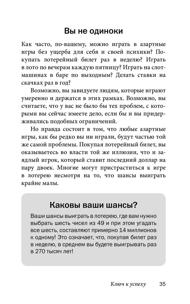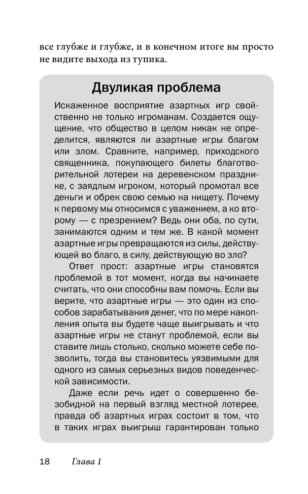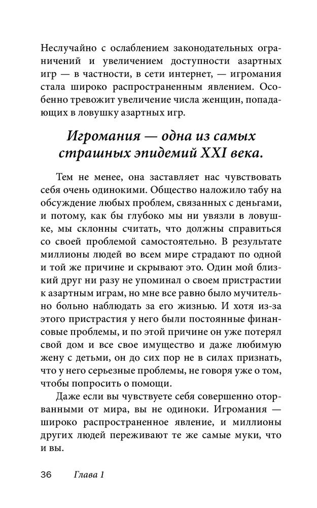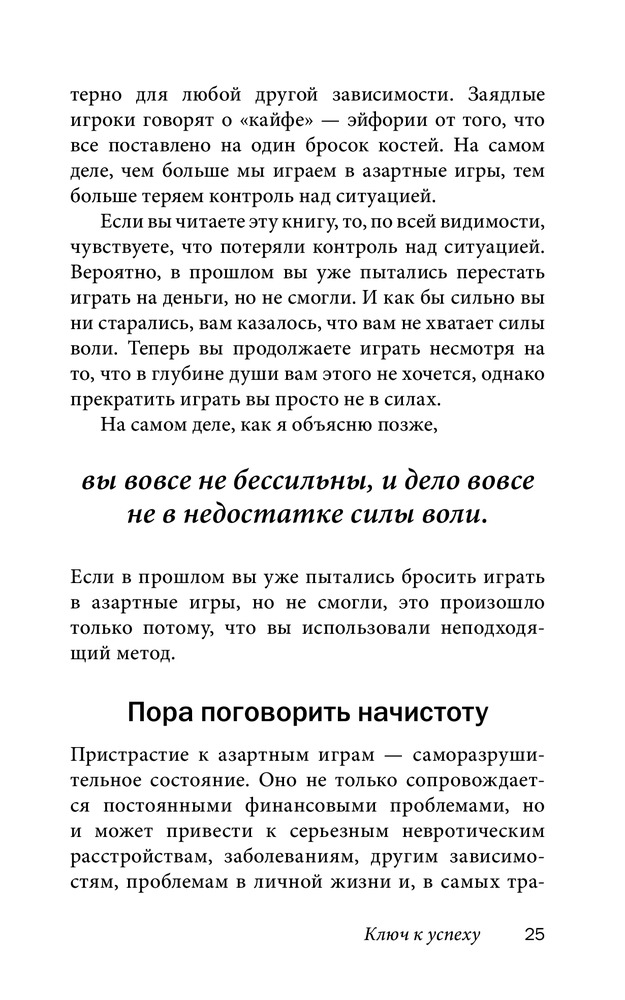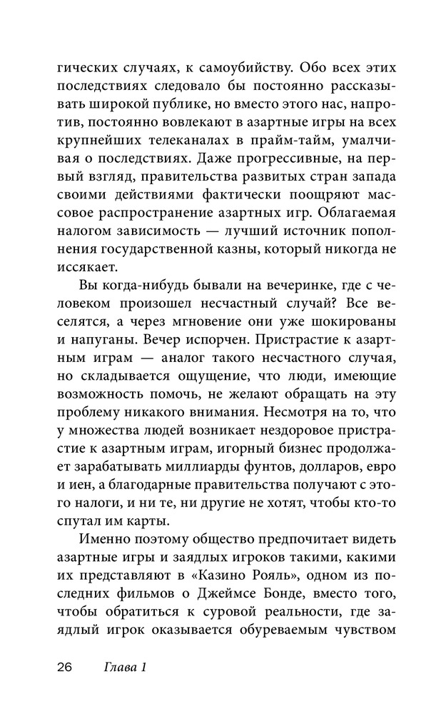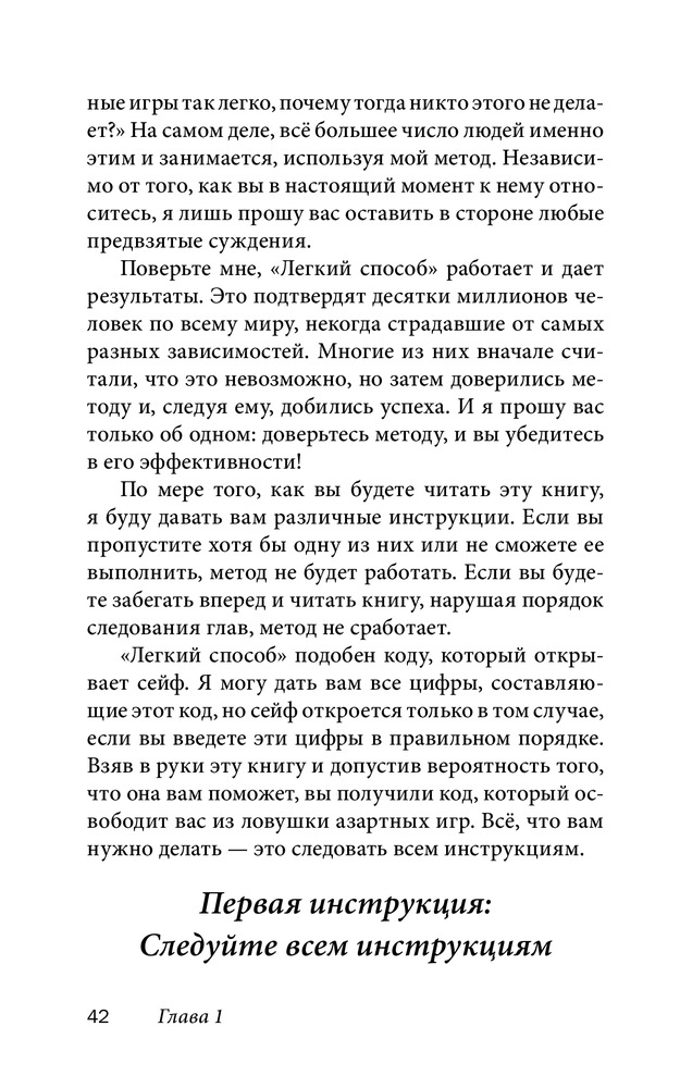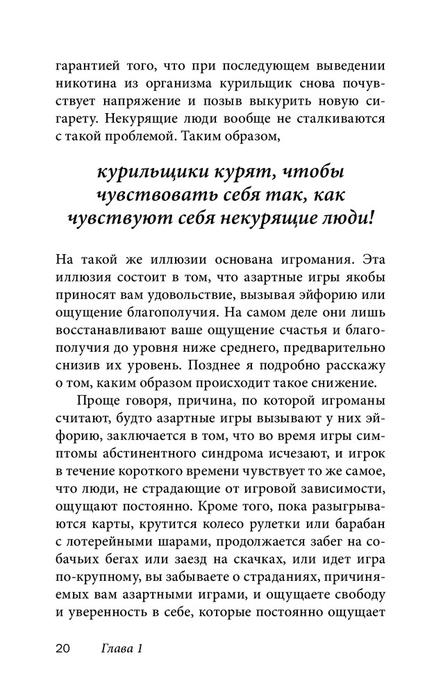 Главная цель этой книги — помочь вам прекратить страдания, которые приносят азартные игры, и стать счастливыми. С помощью «Легкого способа» Аллена Карра вы сможете бросить азартные игры легко, быстро и безболезненно, без мук отвыкания и без использования силы воли. Вы будете в полной мере наслаждаться жизнью без азартных игр, не чувствуя себя лишенными чего-то важного, ибо в процессе чтения книги избавитесь от потребности и желания играть в азартные игры. «Легкий способ» Аллена Карра преобразит вашу жизнь таким же удивительным образом, каким он уже преобразил жизни миллионов людей во всем мире.