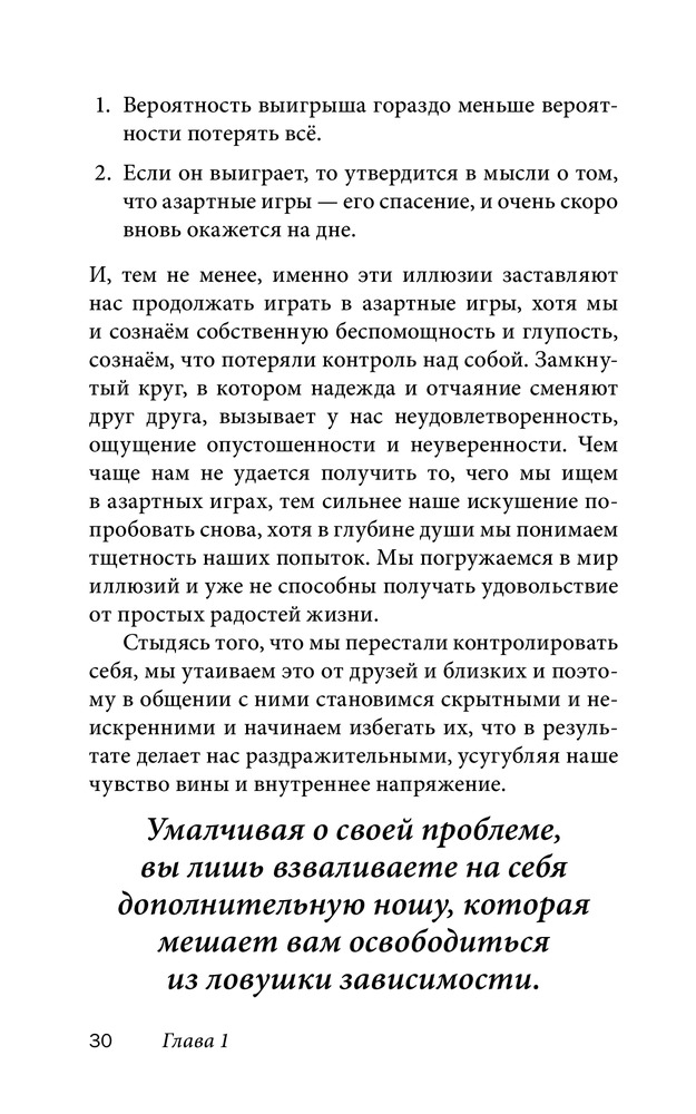 Прочитайте эту книгу, бросьте азартные игры легко и без мук отвыкания, возьмите жизнь в свои руки, станьте свободным и наслаждайтесь жизнью! |