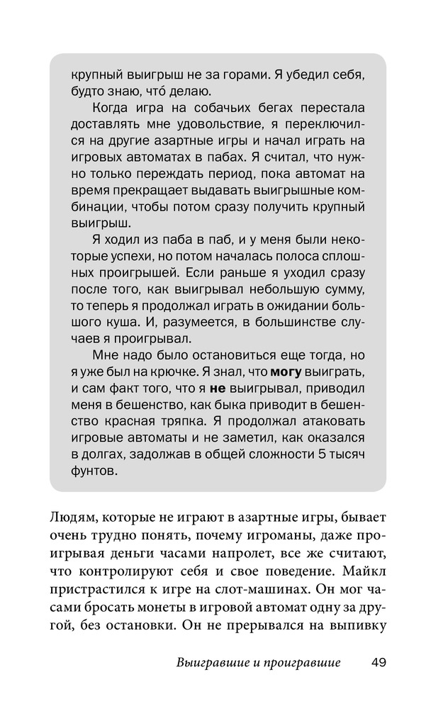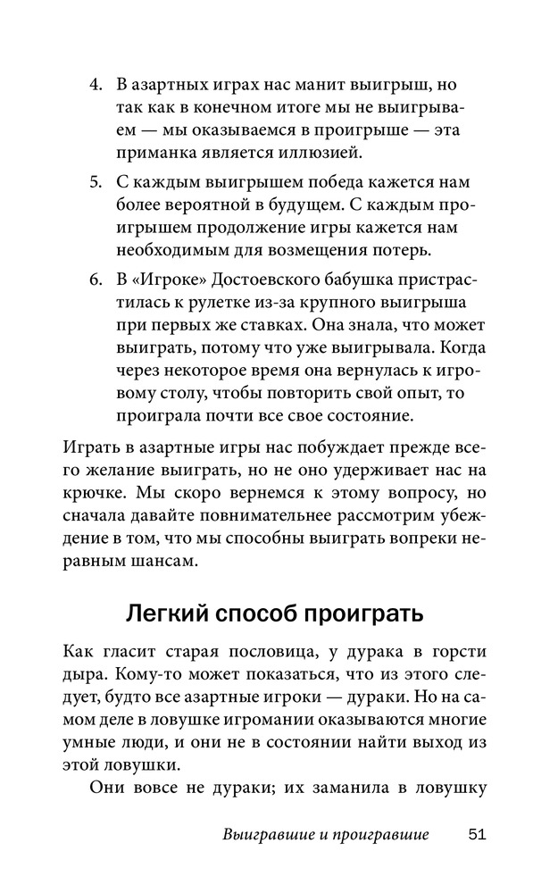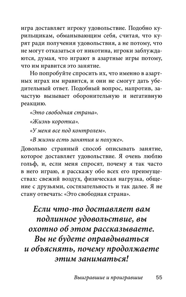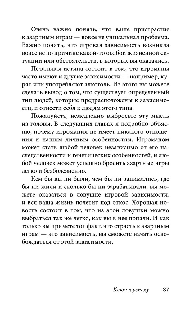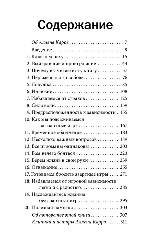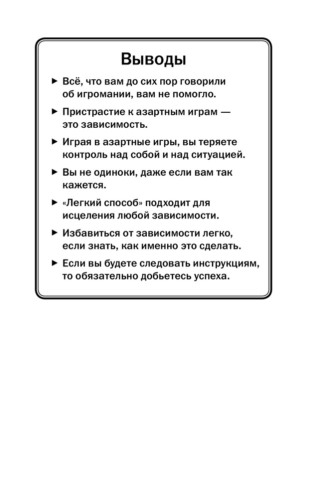 Аллен Карр объясняет, как игроманы попадают в ловушку зависимости и почему они продолжают играть несмотря на то, что азартные игры явно угрожают их благополучию и разрушают их жизнь. Он подробно объясняет механизм формирования зависимости, разбирает навязанные нам психологические установки, формирующие зависимость от азартных игр, помогает избавиться от этих установок и развеивает иллюзии и мифы об азартных играх, которые внедряет в наше сознание игорный бизнес и которые держат нас на крючке игровой зависимости.