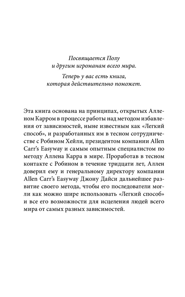 Серия: «Легкий способ» Аллена Карра Будучи заядлым курильщиком, автор этой книги выкуривал по сотне сигарет в день. После множества безуспешных попыток бросить курить он разработал собственный способ избавления от никотиновой зависимости, ныне известный как «Легкий способ бросить курить». Сегодня его метод широко используется для исцеления самых разных расстройств и зависимостей, от алкоголизма и наркомании до переедания и аэрофобии. В этой книге он применяется для исцеления самой быстро распространяющейся зависимости нашего времени — игромании.