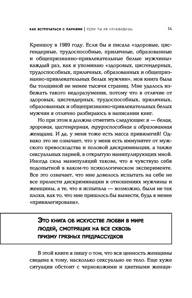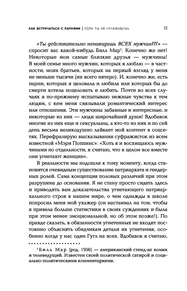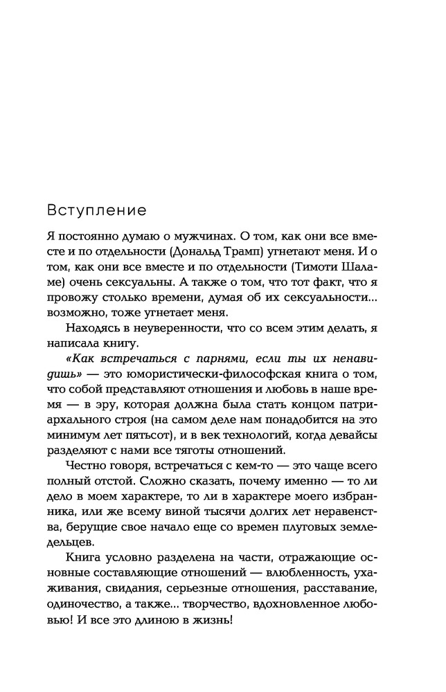 Не смогла дочитать книгу до конца. Автор не отвечает на вопрос "как встречаться с парнями, если ты их ненавидишь?" никоим образом, однако будет рассказывать в сотый раз какой у нее любимый фильм, с кем она встречалась и какие это были парни. Суждения автора зациклены исключительно на ее собственной жизни, что огорчает меня как читателя. Но иногда можно встретить предложения, над которыми можно слегка подумать.