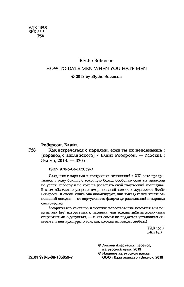 Как встречаться с парнями, если ты их ненавидишьВ данный момент этот товар отсутствует в продаже. Возможно, у нас найдется аналогичный или похожий товар здесь. Серия: Young Adult. Нон-фикшн Свидания с парнями и построение отношений в XXI веке превратились в одну большую головную боль... особенно если ты нацелена на успех, карьеру и не хочешь растерять свой творческий потенциал. В этом абсолютно уверена американский комик и журналист Блайт Роберсон. В своей книге она анализирует, как выглядят все этапы отношений сегодня — от виртуального флирта до расставаний и периода одиночества. Уморительно смешное и честное повествование поможет вам понять, как (не) встречаться с парнями, чьи головы забиты дремучими стереотипами о девушках — и как самой не поддаться установкам общества и поп-культуры о том, как должна выглядеть любовь! |