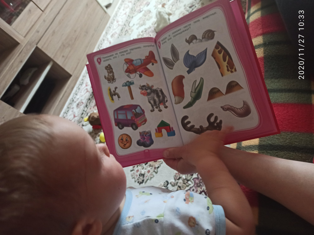 Книга очень яркая. Моему малышу очень понравилась. Очень много полезного материала, который понятен для возраста от года до двух. Надеюсь скоро наш словарный запас обогатится. Спасибо. Книгу доставили быстро.
