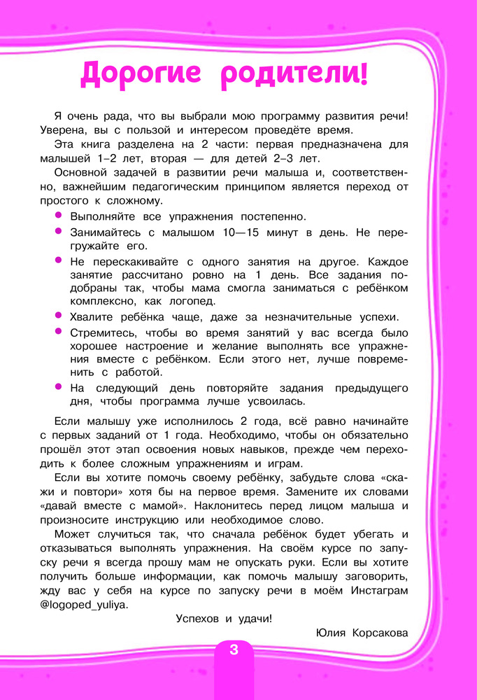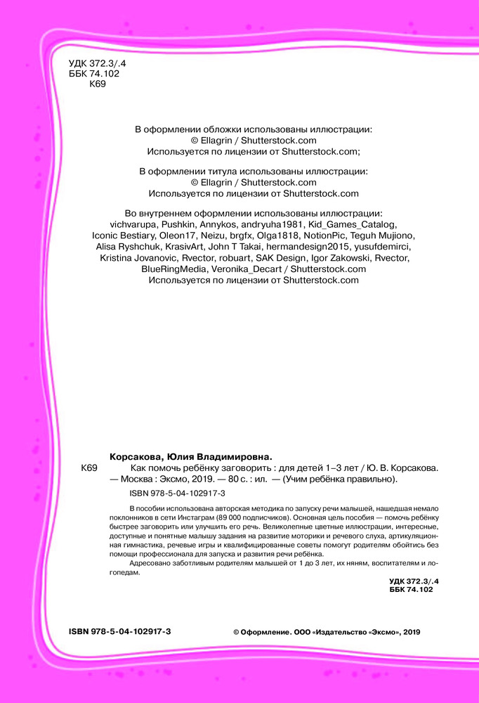 Как помочь ребёнку заговорить. Для детей 1-3 летВ данный момент этот товар отсутствует в продаже. Возможно, у нас найдется аналогичный или похожий товар здесь. Серия: Учим ребёнка правильно В пособии использована авторская методика по запуску речи малышей, нашедшая немало поклонников в сети инстаграм (89 000 подписчиков). Основная цель пособия — помочь ребёнку быстрее заговорить или улучшить его речь. Великолепные цветные иллюстрации, интересные, доступные и понятные малышу задания на развитие моторики и речевого слуха, артикуляционная гимнастика, речевые игры и квалифицированные советы помогут родителям обойтись без помощи профессионала для запуска и развития речи ребёнка. Адресовано заботливым родителям малышей от 1 до 3 лет, их няням, воспитателям и логопедам. |