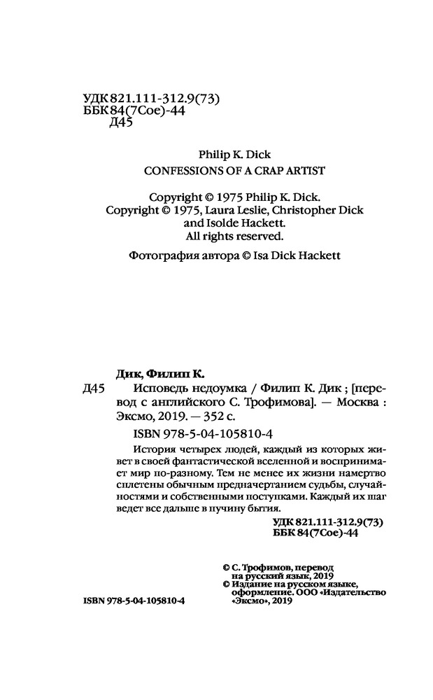 Исповедь недоумкаВ данный момент этот товар отсутствует в продаже. Возможно, у нас найдется аналогичный или похожий товар здесь. Серия: Филип К. Дик. Электрические сны История четырёх людей, каждый из которых живёт в своей фантастической вселенной и воспринимает мир по-разному. Тем не менее их жизни намертво сплетены обычным предначертанием судьбы, случайностями и собственными поступками. Каждый их шаг ведет все дальше в пучину бытия. |