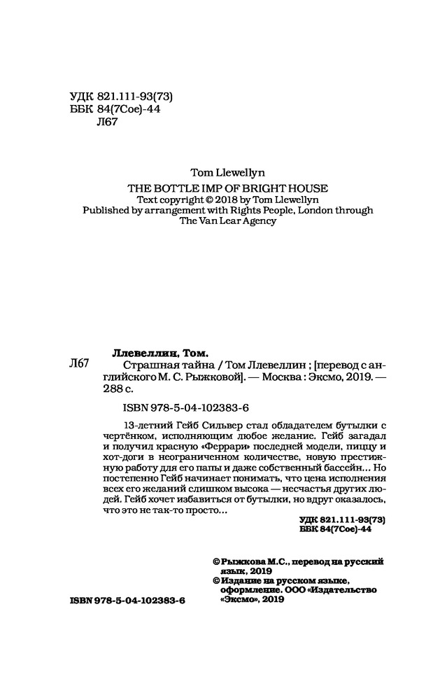 Серия: Детская. Фэнтези для подростков 13-летний Гейб Сильвер стал обладателем бутылки с чертёнком, исполняющим любое желание. Гейб загадал и получил красную феррари последней модели, пиццу и хот-доги в неограниченном количестве, новую престижную работу для его папы и даже собственный бассейн... Но постепенно Гейб начинает понимать, что цена исполнения всех его желаний слишком высока — несчастья других людей. Гейб хочет избавиться от бутылки, но вдруг оказалось, что это не так-то просто... |