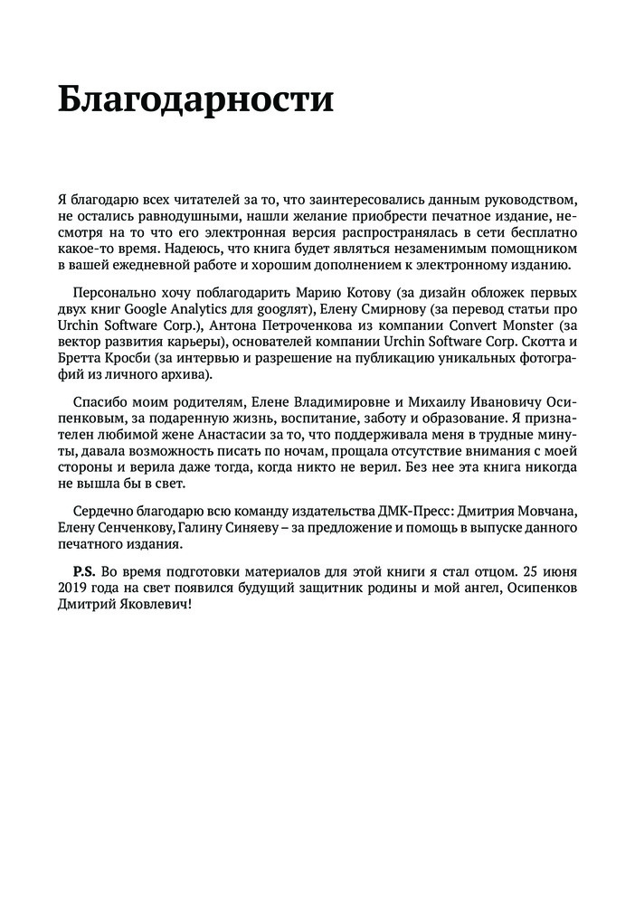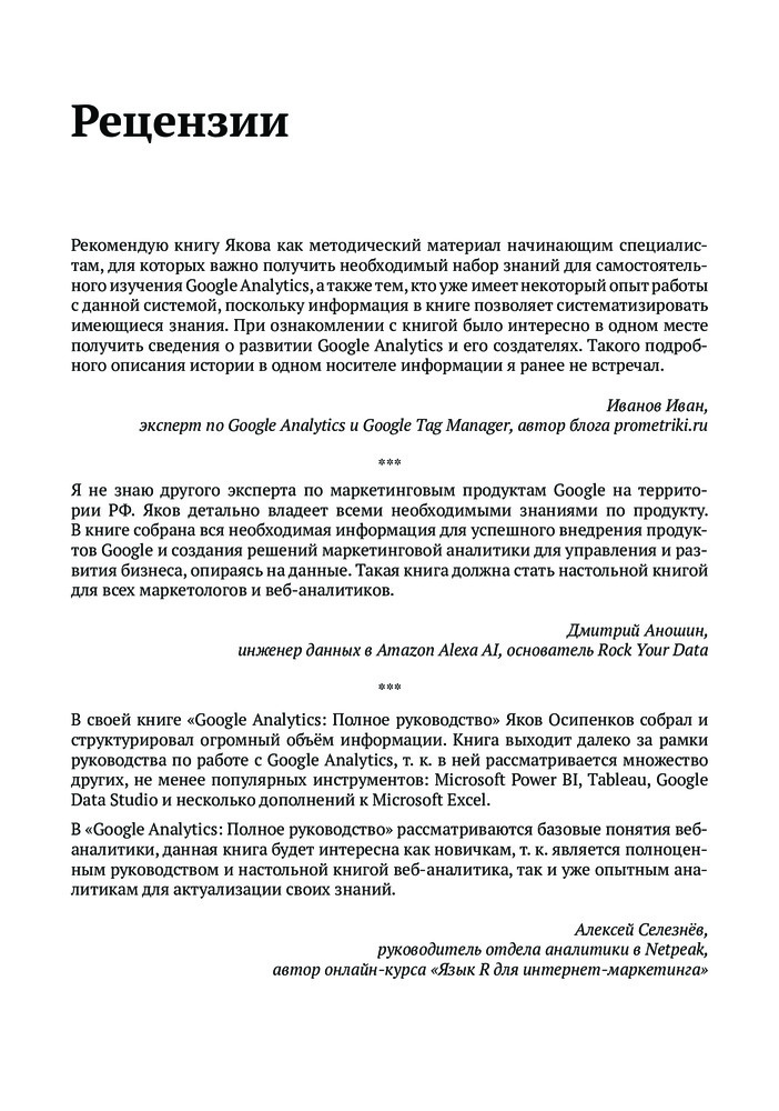 Google Analytics 2019. Полное руководствоВ данный момент этот товар отсутствует в продаже. Возможно, у нас найдется аналогичный или похожий товар здесь. В данной книге вы найдете исчерпывающие материалы по настройке и работе с самым популярным инструментом веб-аналитики в мире. Темы, которые разбираются в руководстве: настройка целей, событий, электронная торговля, функция User ID, когортный анализ, ассоциированные конверсии и многоканальные последовательности, ремаркетинг, динамический ремаркетинг, междоменное отслеживание, Measurement Protocol, файлы cookie, уникальный идентификатор отслеживания (он же Client ID), эксперименты Google Analytics, а также визуализация данных в Google Data Studio, Microsoft Power BI и Tableau. |