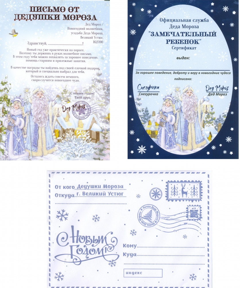 Феникс Презент Комплект новогодний «Письмо от Дедушки Мороза»В данный момент этот товар отсутствует в продаже. Возможно, у нас найдется аналогичный или похожий товар здесь. Комплект новогодний «Письмо от Дедушки Мороза» принесет огромную радость ребенку! Выполненное на красивой бумаге с тиснением, настоящее письмо от новогоднего волшебника вызовет восторг и позволит поверить в сказку. |