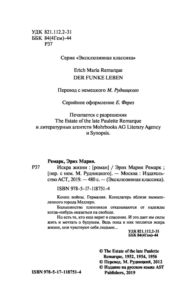 💳 Оплатить за товар можно при получении 🇰🇿 Есть бесплатная доставка по Казахстану 🎁 Копите бонусы с каждой покупки Серия: Эксклюзивная классика (Лучшее) Конец войны. Германия. Концлагерь вблизи вымышленного города Меллерн. Большинство пленников отказываются от надежды когда-нибудь оказаться на свободе. Но есть те, кто еще верит в спасение. И это дает им силы жить и мечтать о будущем. Ведь пока в них теплится искра жизни, они чувствуют себя людьми... |
