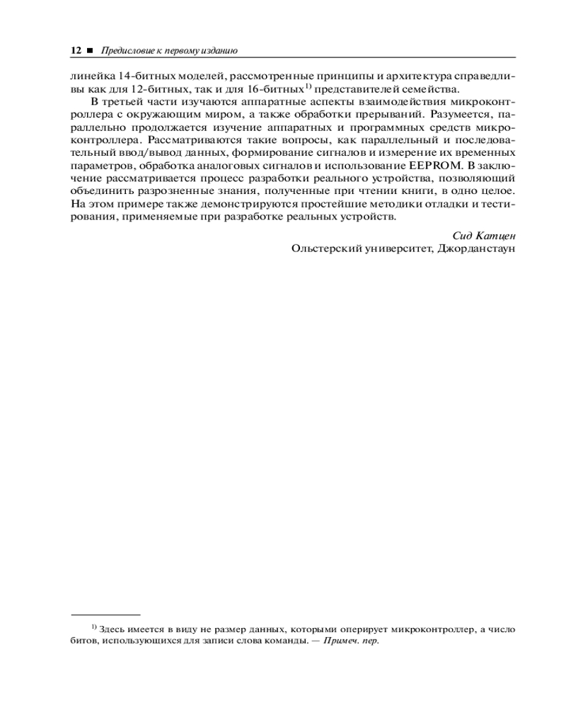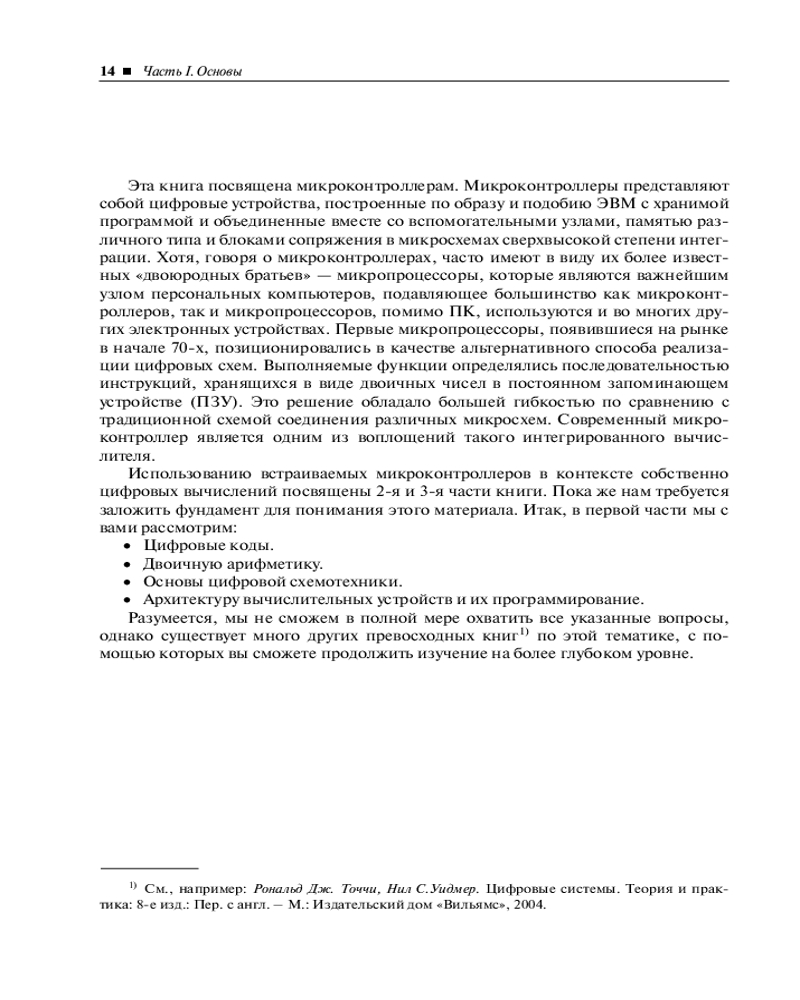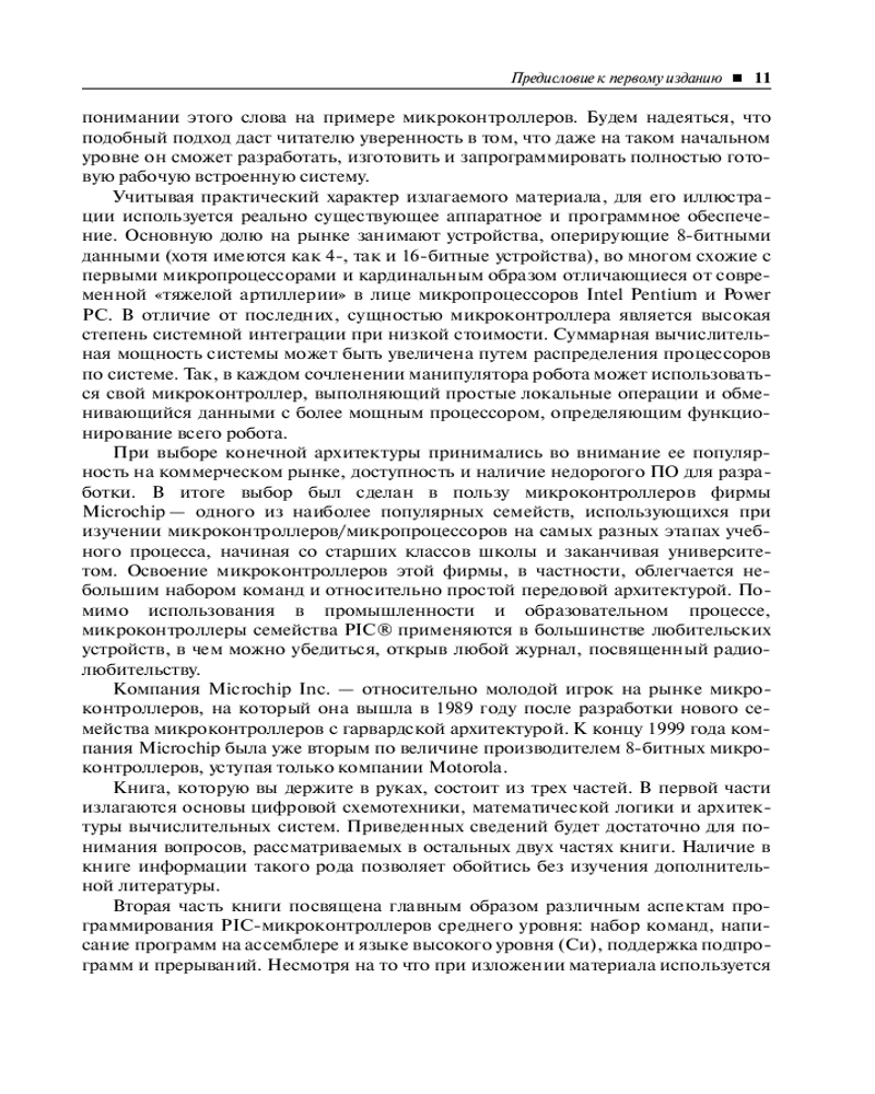 Серия: Программируемые системы Данная книга представляет собой исчерпывающее руководство по микроконтроллерам семейства PIC компании Microchip, являющегося промышленным стандартом в области встраиваемых цифровых устройств. В книге подробно описывается архитектура и система команд 8-битных микроконтроллеров PIC, на конкретных примерах изучается работа их периферийных модулей. В первой части излагаются основы цифровой схемотехники, математической логики и архитектуры вычислительных систем. Вторая часть посвящена различным аспектам программирования PIC-микроконтроллеров среднего уровня: описывается набор команд, рассматривается написание программ на ассемблере и языке высокого уровня (Си), а также поддержка подпрограмм и прерываний. |