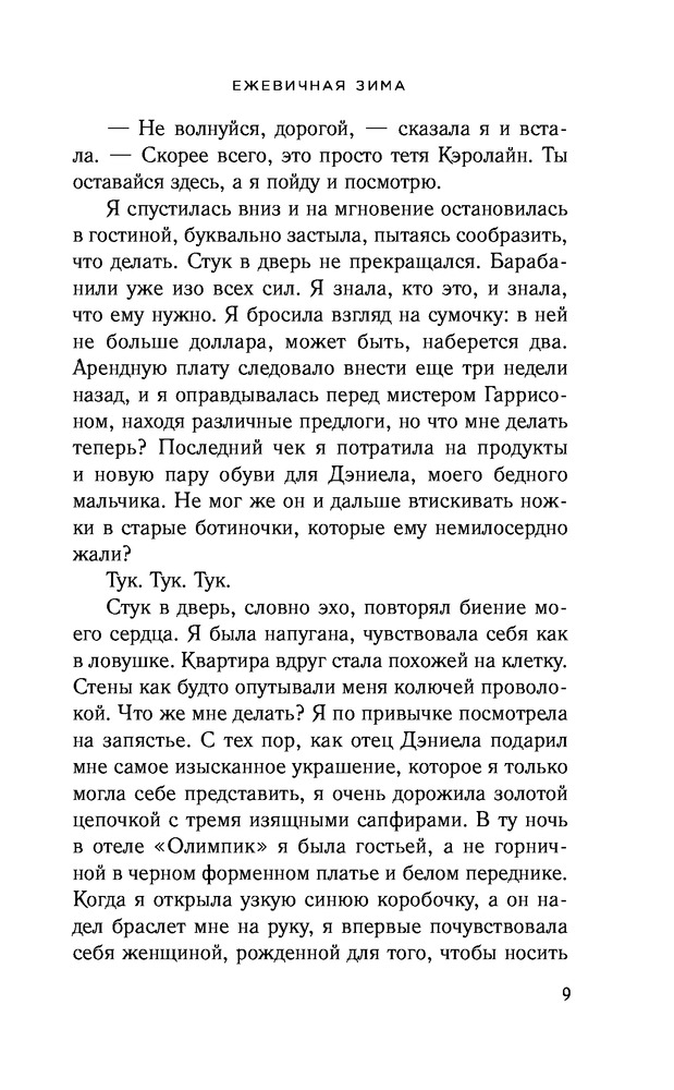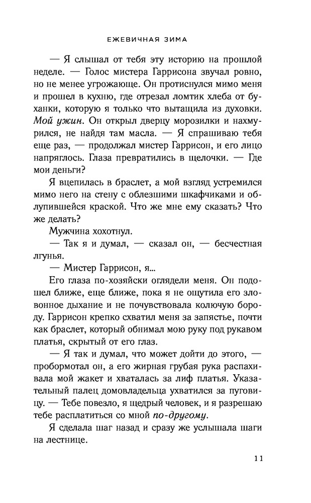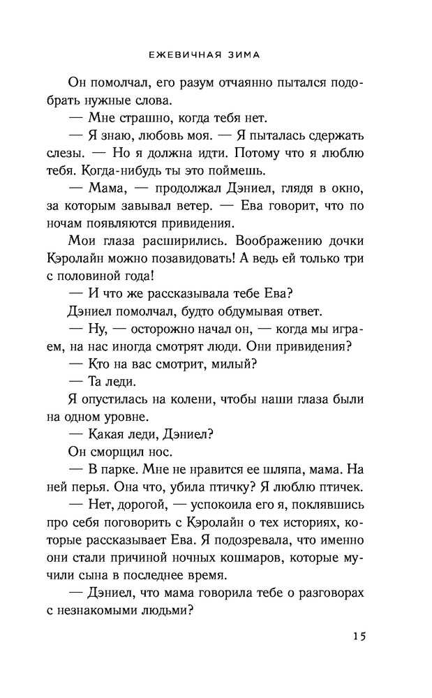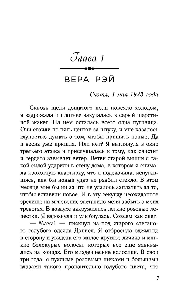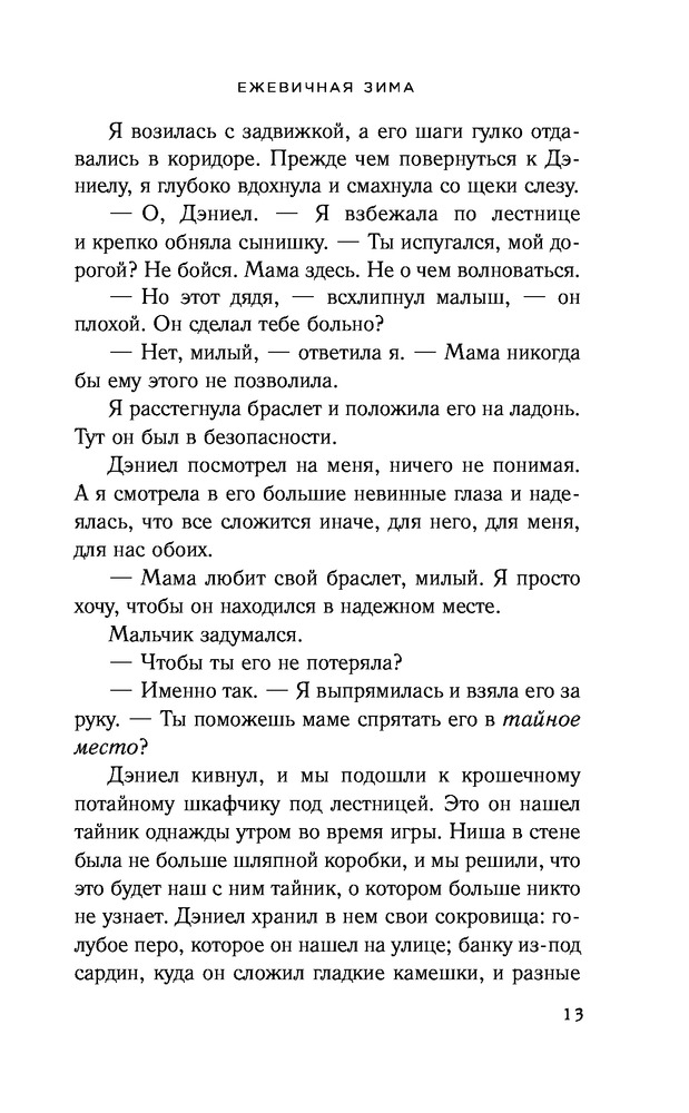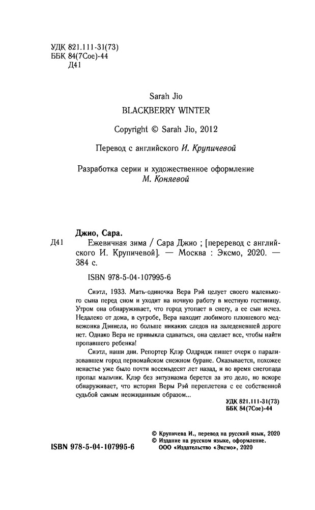 Ежевичная зимаВ данный момент этот товар отсутствует в продаже. Возможно, у нас найдется аналогичный или похожий товар здесь. Серия: Книжный курорт (зима - весна 2020) Сиэтл, 1933. Мать-одиночка Вера Рэй целует своего маленького сына перед сном и уходит на ночную работу в местную гостиницу. Утром она обнаруживает, что город утопает в снегу, а ее сын исчез. Недалеко от дома, в сугробе, Вера находит любимого плюшевого медвежонка Дэниела, но больше никаких следов на заледеневшей дороге нет. Однако Вера не привыкла сдаваться, она сделает все, чтобы найти пропавшего ребенка! Сиэтл, 2010. Репортер Клэр Олдридж пишет очерк о парализовавшем город первомайском снежном буране. Оказывается, похожее ненастье уже было почти восемьдесят лет назад, и во время снегопада пропал мальчик. Клэр без энтузиазма берется за это дело, но вскоре обнаруживает, что история Веры Рэй переплетена с ее собственной судьбой самым неожиданным образом... |