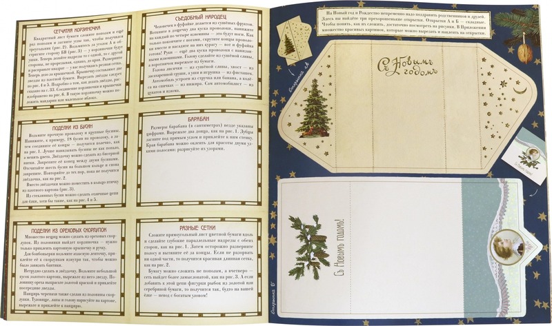 А ещё 3 оригинальных открытки, золотые и серебряные картонажи, узорные полосы для склеивания бумажных цепей-гирлянд и 6 разрезных карточек с описаниями, как из самых простых подручных материалов сделать затейливые вещицы.