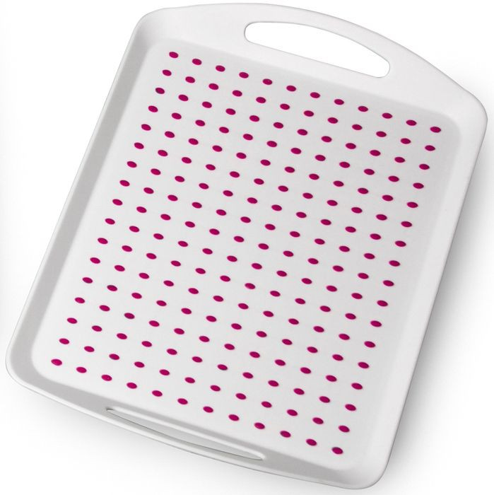 Разносик симпатичный. с противоскольжением. пупырышки зеленые тоже не скользят. один недостаток- тонковат или лучше сказать мягковат. сомневаюсь что можно на нем нести например много тарелок...но я брала для другой цели мне подошел.