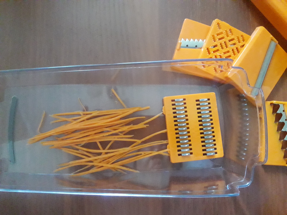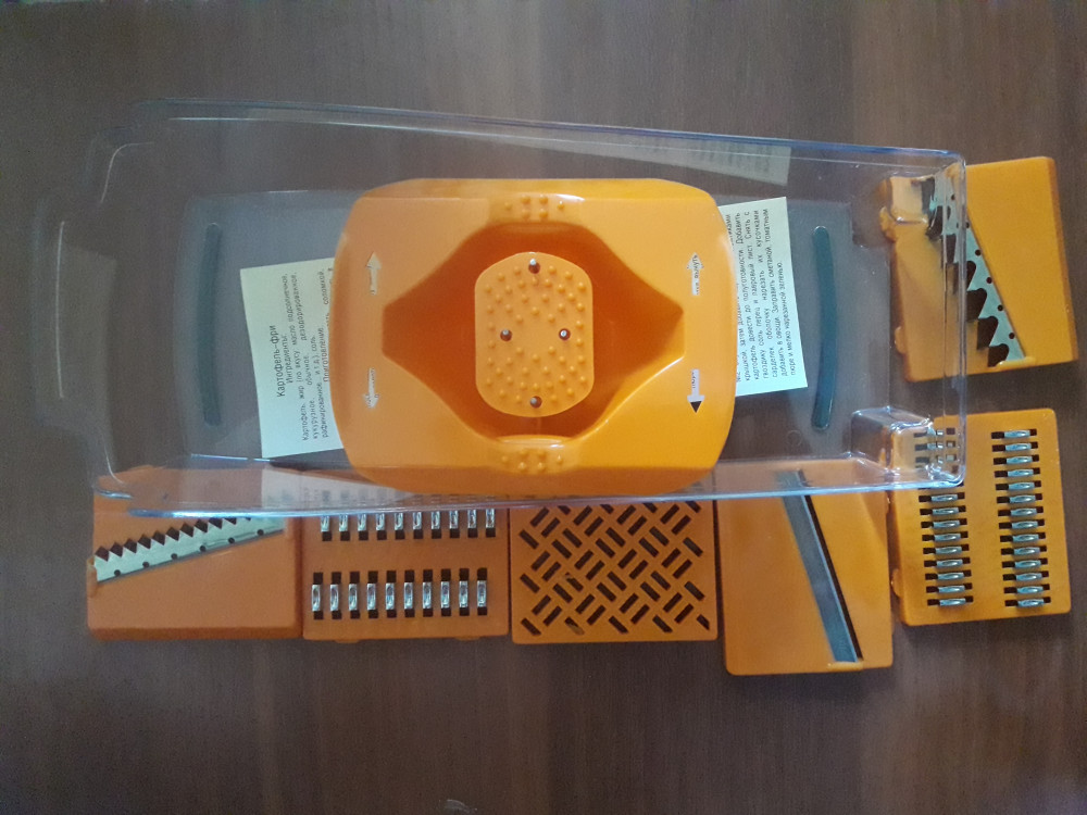 На первый раз очь хорошо ножи острые, удобные, разные. Наша старая терка для моркови по корейский уже совсем рассыпалась, хотелось чего небудь из цена качество, на эту терку отзывы в инете хорошие и выбрала ее. Есть 6 сменных ножей контеинер под терку. Вкладыш с рецептами. Держатель плода.пластик крепки. Нет запаха.в бумажной коропке. Спасибо магазину за быструю доставку и широки выбор.