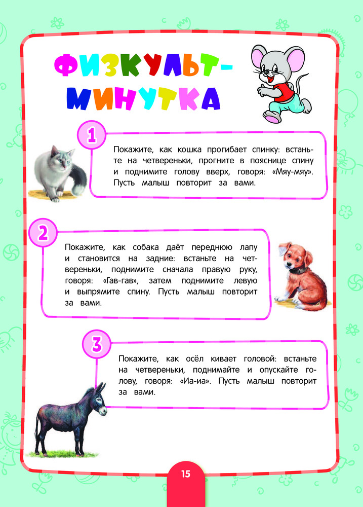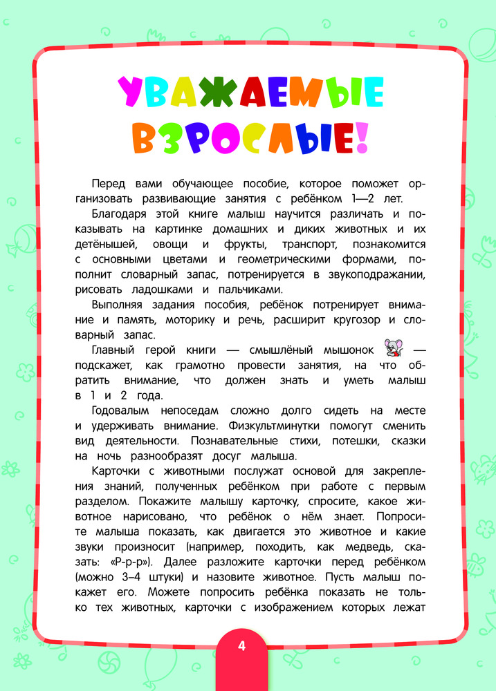 💳 Оплатить за товар можно при получении 🇰🇿 Есть бесплатная доставка по Казахстану 🎁 Копите бонусы с каждой покупки Серия: Основы дошкольных знаний. Годовой курс обучения (с карточками) Благодаря этой книге малыш научится различать домашних и диких животных и их детёнышей, овощи и фрукты, транспорт, познакомится с основными цветами и геометрическими формами, пополнит словарный запас, потренируется в звукоподражании, попробует рисовать ладошками и пальчиками. Выполняя задания пособия, ребёнок потренирует внимание и память, моторику и речь, расширит кругозор и словарный запас. Главный герой книги — смышлёный мышонок — подскажет, как грамотно провести занятия, на что обратить внимание, что должен знать и уметь малыш в 1 и 2 года. Физкультминутки помогут сменить вид деятельности, потому что годовалым непоседам сложно долго сидеть на месте и удерживать внимание. А познавательные стихи, потешки, сказки на ночь внесут разнообразие в развивающие занятия. Карточки с животными послужат основой для закрепления знаний и помогут превратить обучение в интересную игру. Адресовано неравнодушным родителям малышей от года до двух для проведения развивающих занятий в течении года и организации полезного досуга. |