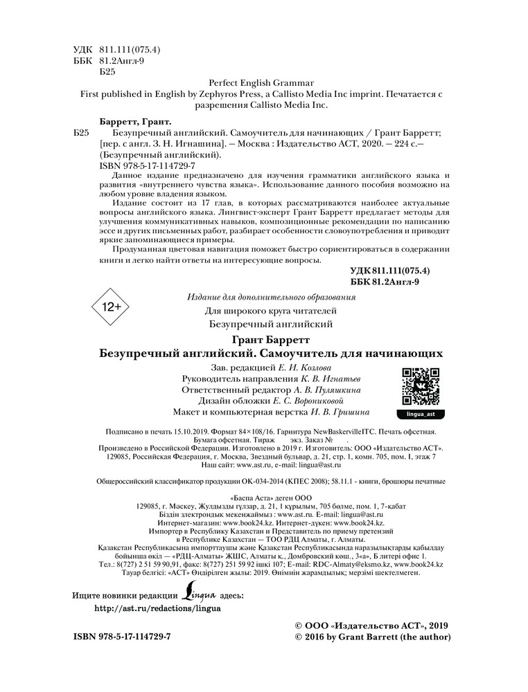 Безупречный английский. Самоучитель для начинающихВ данный момент этот товар отсутствует в продаже. Возможно, у нас найдется аналогичный или похожий товар здесь. Серия: Безупречный английский Данное издание предназначено для изучения грамматики английского языка и развития «внутреннего чувства языка». Использование данного пособия возможно на любом уровне владения языком. Издание состоит из 17 глав, в которых рассматриваются наиболее актуальные вопросы английского языка. Лингвист-эксперт Грант Барретт предлагает методы для улучшения коммуникативных навыков, композиционные рекомендации по написанию эссе и других письменных работ, разбирает особенности словоупотребления и приводит яркие запоминающиеся примеры. Продуманная цветовая навигация поможет быстро сориентироваться в содержании книги и легко найти ответы на интересующие вопросы. |